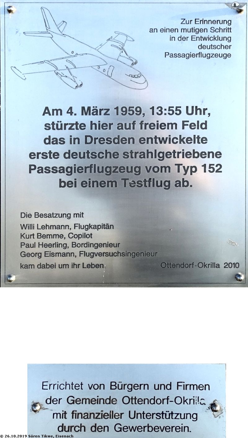 Im Gewerbegebiet von Ottendorf-Okriela nahe Dresden wurde an der AbsturzStelle zum Gedenken an die verunfallte Besatzung der Baade 152 V1 ein Denkmal aufgebaut.