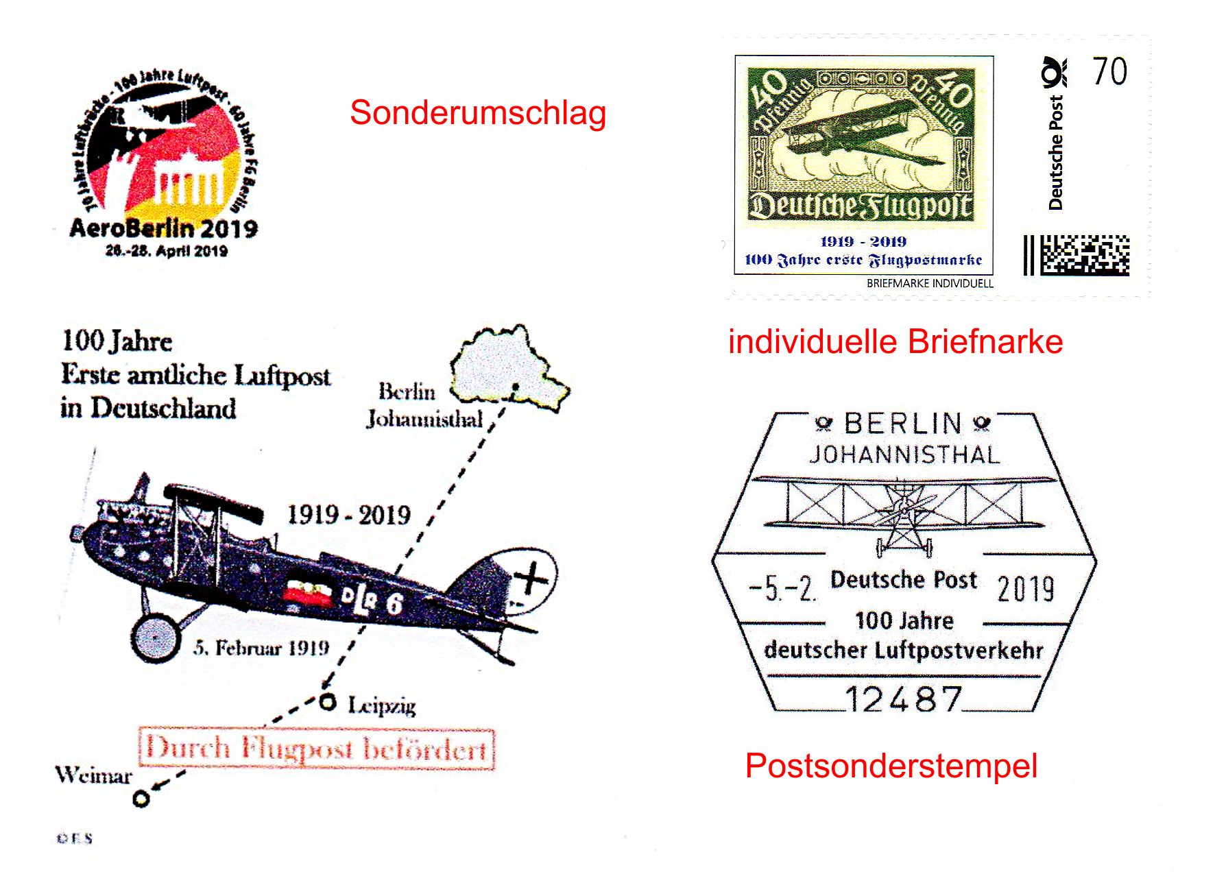 Auch zu besonderen Anlässen, wie "100 Jahre amtliche regelmäßige Luftpost in Deutschland" siehe Abbildung zur ersten Luftpostverbindung Berlin - Weimar am 5. Februar 1919.