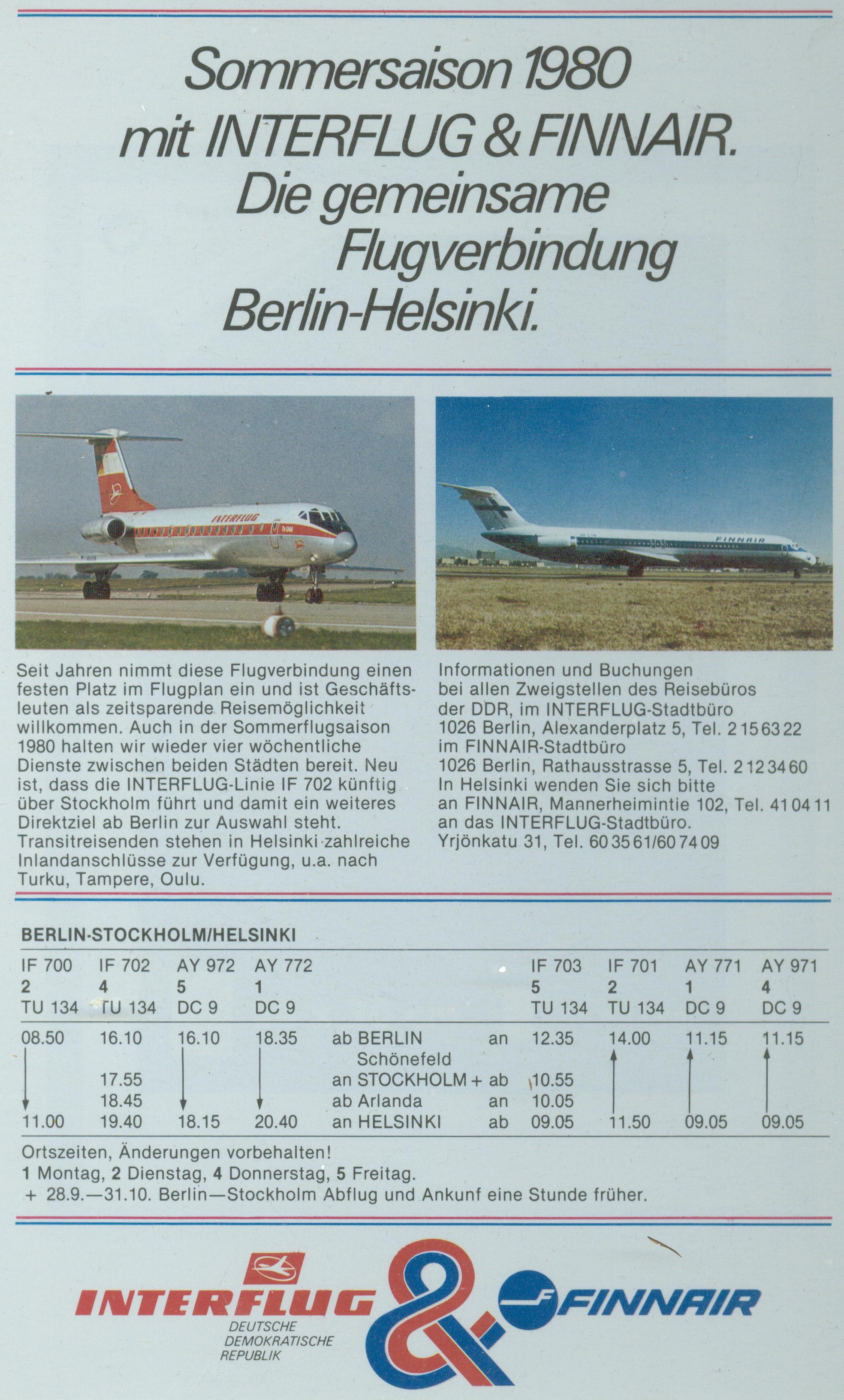 Werbeblatt INTERFLUG/FINNAIR für Flüge zwischen Berlin-Schönefeld & Helsinki in DIN A4 Größe.