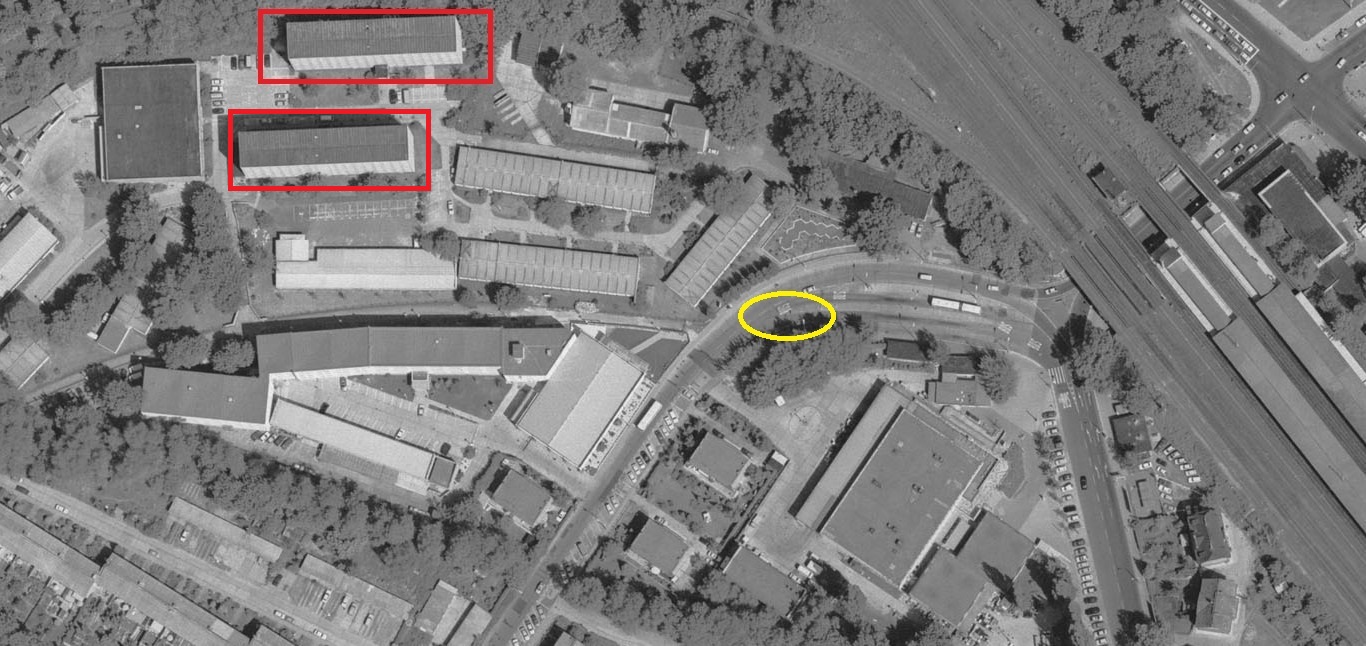 Mein Ausschnitt zeigt diese Lage im Jahr 1992, die beiden rot umränderten Neubauten kämen eventuell als der Hintergrund auf dem Haltestellenfoto von 1978 infrage. Alle anderen Gebäude waren eingeschossig und existieren teilweise nicht mehr.