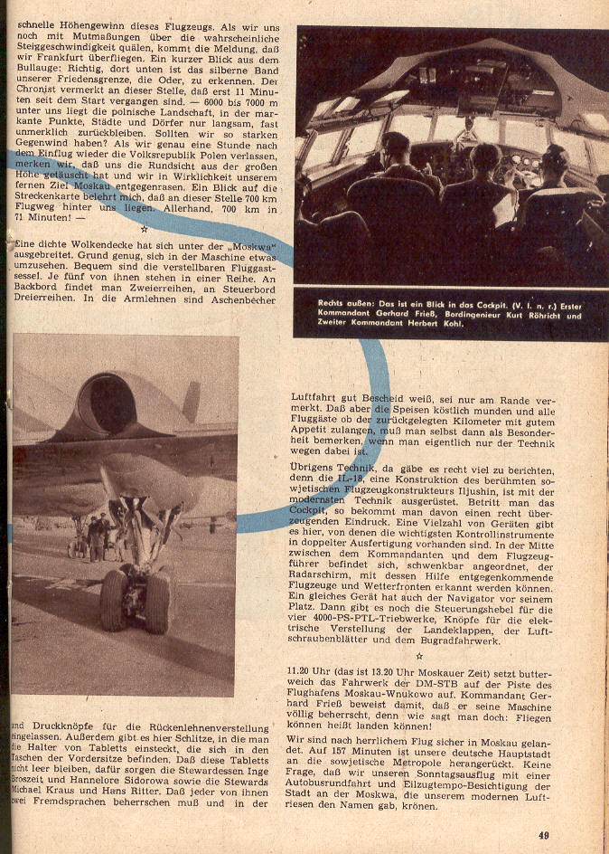 mit der IL-14 habe ich keinen Moskauflug entdeckt. Dafür aber mit der IL 18. Der Erstflug der IL-18 der DLH im Linienverkehr nach Moskau Wnukowo. Beschrieben in der "Jugend und Technik" Juni 1960. Als Besatzung sind genannt: