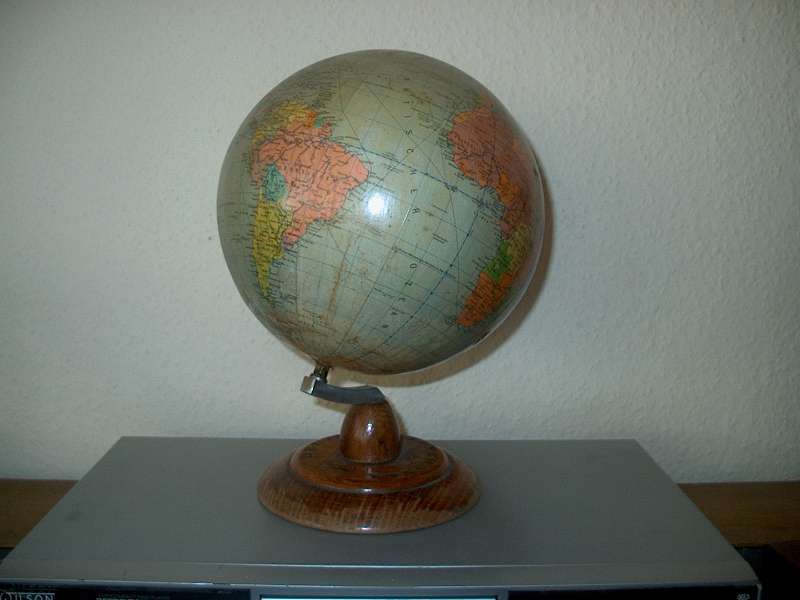 Material: Kugel aus sehr harter Pappe & der Sockel aus lakiertem Holz.