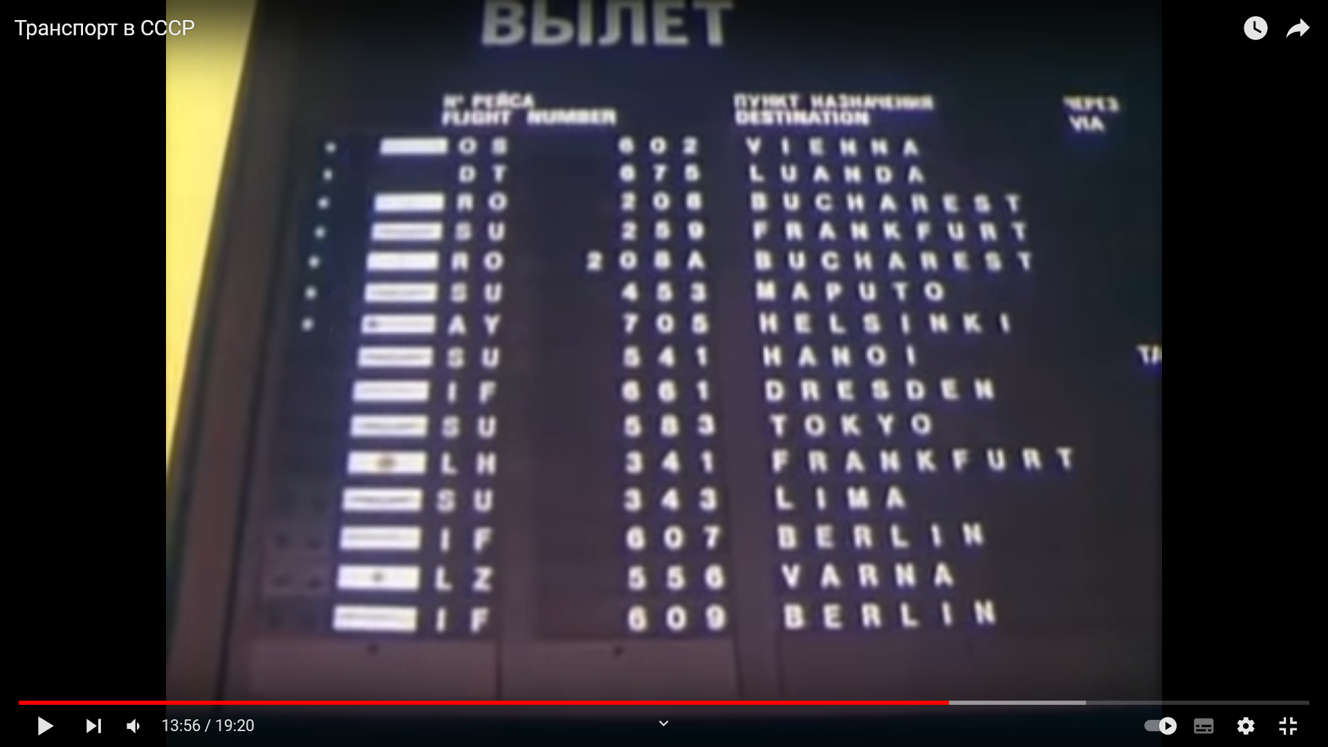 Mir ist es eben gelungen, aus einem bei Youtube hochgeladenen Sowjetischen Werbefilm eine Abbildung der Abfluganzeige in Moskau-Scheremetjevo hochzulasen.