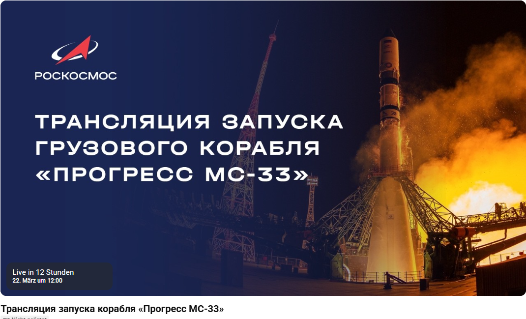Roscosmos stellte fest, dass die Vorbereitungen für den Start des Frachtraumschiffs Progress MS-33 beginnen können, mit Start für den 22. März