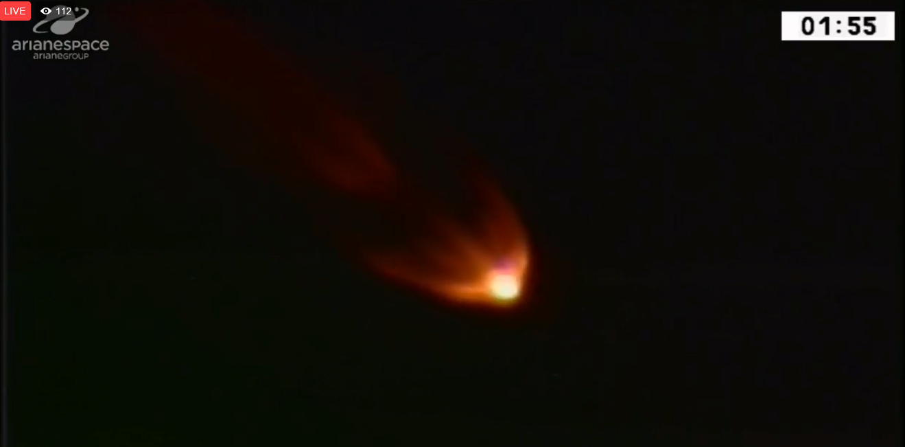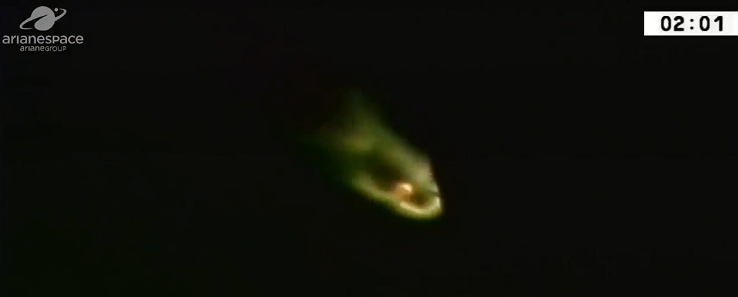 * Vor der Separation der 1. Stufe (der vier Außenblöcke) wird der Schub auf 75% reduziert, deutlich an der Flammedie anschließend grün wird aufgrund KerosinüberschußDie Außenblöcke sind am TW-Ende (unten) freigegeben - der Stern, der anschließend rotiert durch den Druckgasaustoß an den SpitzenDie zweite Stufe ist weg, Fairing ebenfalls, die dritte Stufe feuertBrenn Ende / SeparationZündung der Fregat-OberstufeEs folgen zwei Korrektur: 3 Brennphasen der "Fregat", um die startbedingte elliptische Bahn in die erforderliche Kreisbahn zu transformieren (1. Stabile Parkbahn; 2. Erreichen des Apogäums am errechneten Aussetzpunkt; 3. Abflachen zur Kreisbahn / und nach dem Brenn Ende Separation der "Fregat" und die Verantwortung geht an die ESA rsp. später EUMETSAT überEuropa hat seinen drittes Wetterobservatorium. Details dazu auch https://www.dlr.de/dlr/desktopdefault.a ... lery/32601