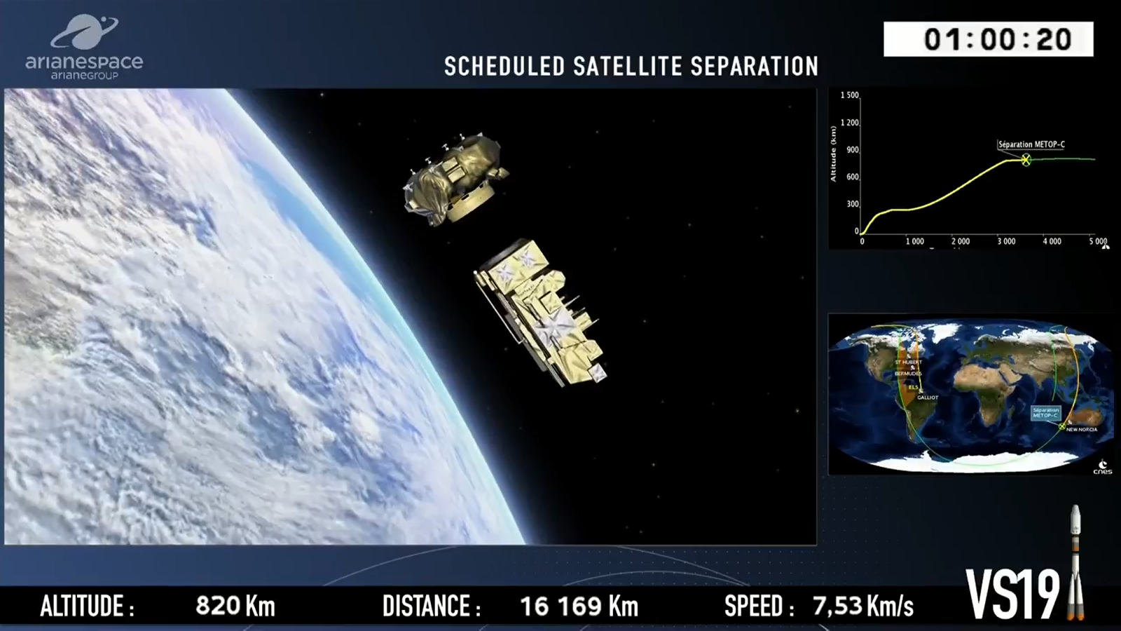 Der MetOp C wurde von Airbus Defense und Space gebaut und ist der dritte in einer Reihe von europäischen Wettersatelliten, die die atmosphärischen Bedingungen, Wolken und Stürme, Schnee-und Eisdecke, Meerestemperaturen und Winde überwachen sollen.