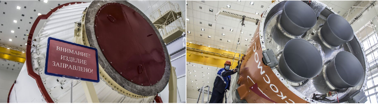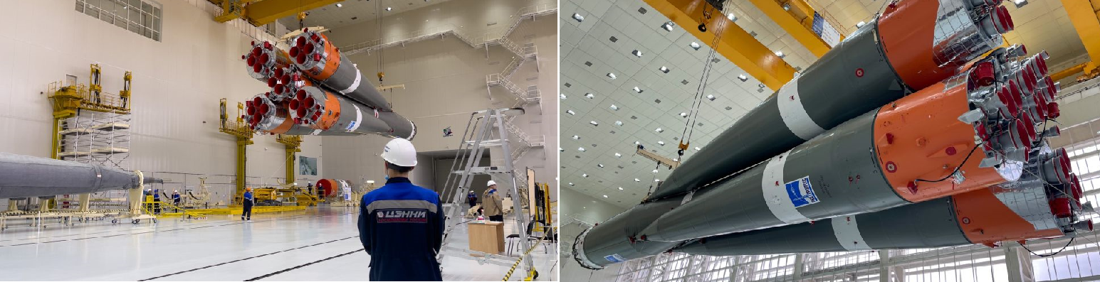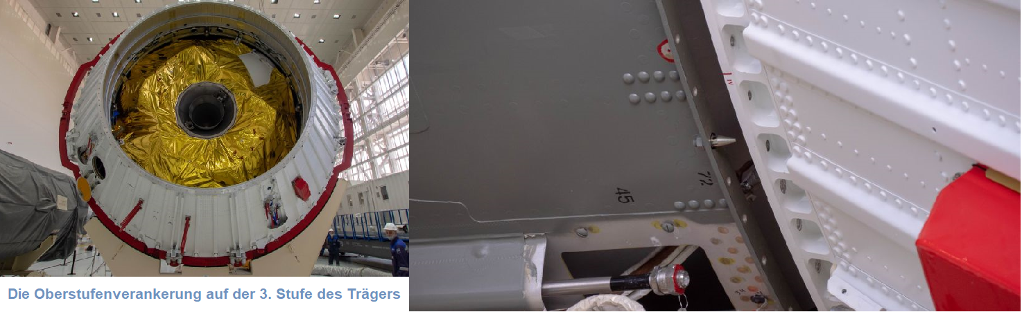 Aus der Galerie zur Vorbereitung die "Hochzeit" des Oberstufenpaketes (li) mit der 3. Stufe (re) https://www.roscosmos.ru/31104/