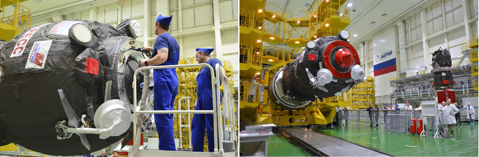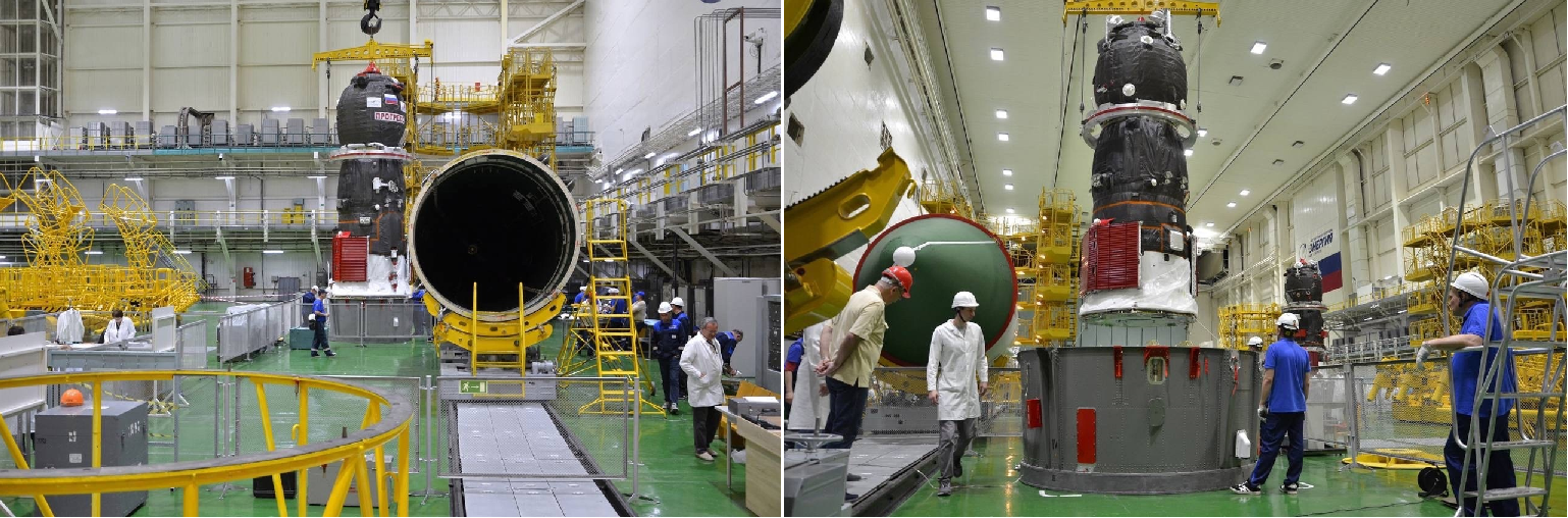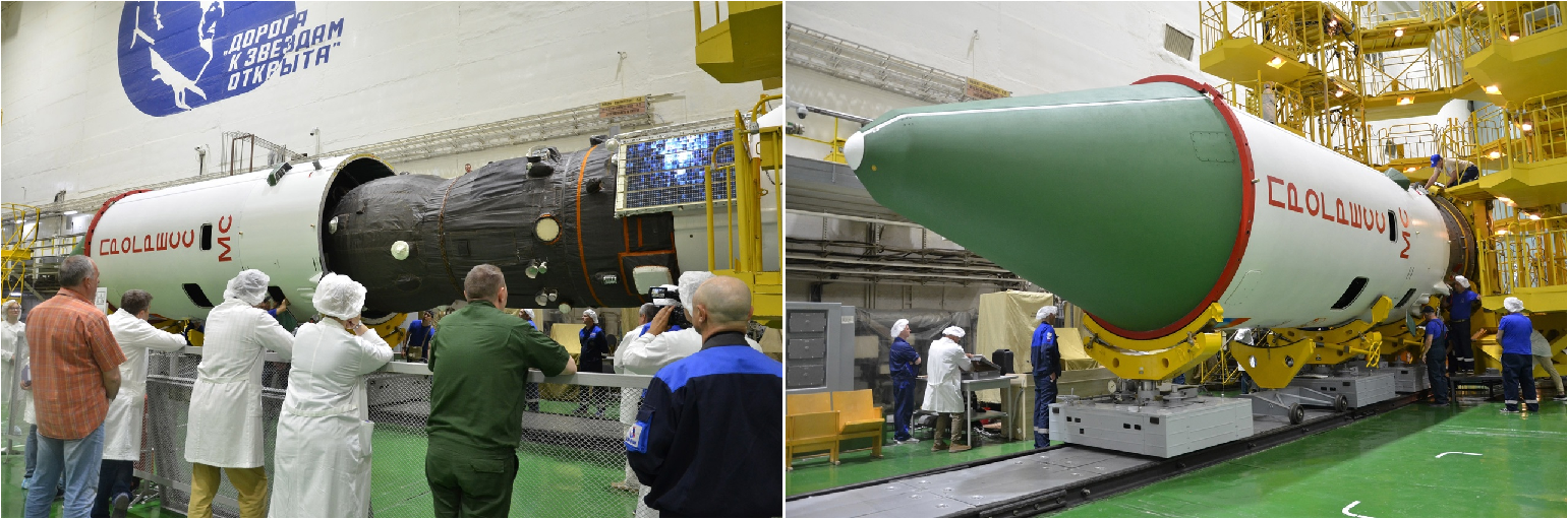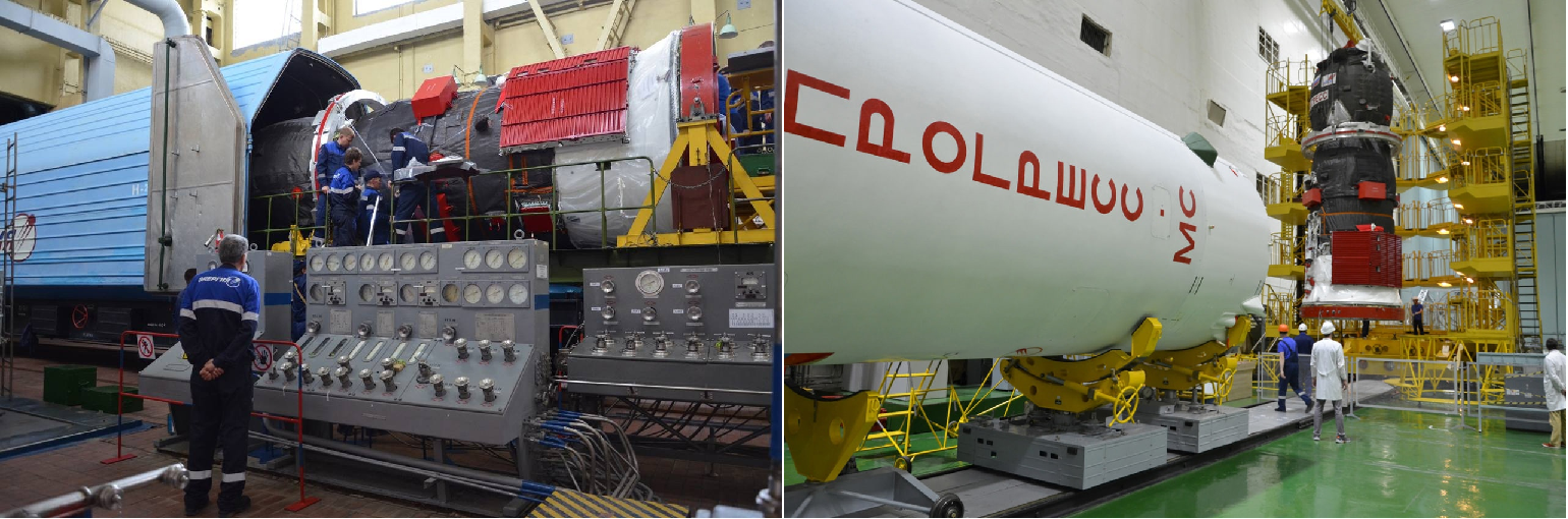 Der Frachter "Progress MS-27" wurde heute nach Abschluß aller Prüfarbeiten unter seine Nutzlastverkleidung (Fairing) bugsiert