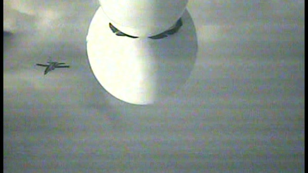 Begleitet von einer F-18 "Hornet" -hier ein Bild auf die first stage der Pegasus Kameramontage Unterseite der L-1011.