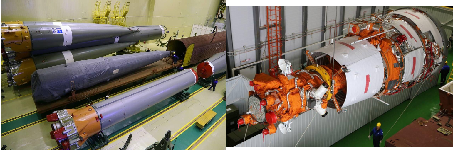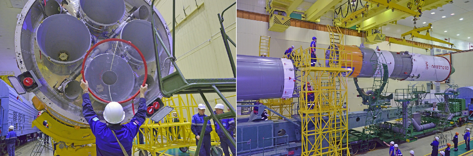 - dann werden die rot gekennzeichneten Schutzhauben aus den Schubdüsen der 3. Stufe der Sojus-2-1A entfernt, die Montage der 3. Stufe + Nutzlast mit dem (vorher fertig gestellten) Träger kann erfolgen: