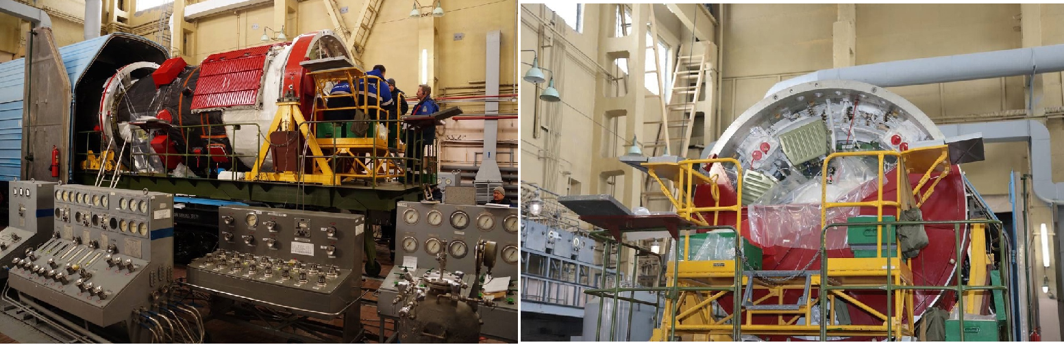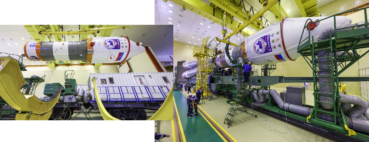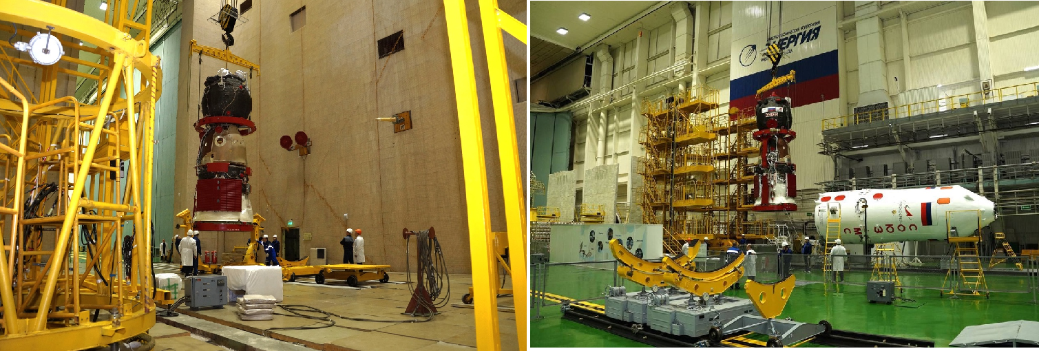 Die Spezialisten entluden ebenfalls den Satelliten "Resurs-P Nr. 5" und installierten ihn im MIK, Platz 112, auf dem Prüfstand zur weiteren Vorbereitung des Starts (Rechts)