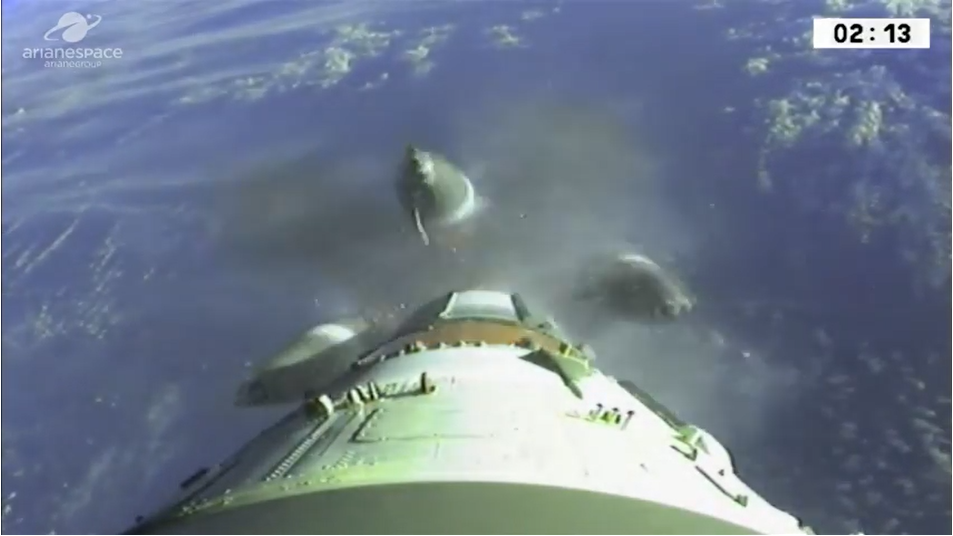 Von der Onboard-Kamera die sehr saubere Trennung der 4 Außenblöcke (1. Stufe) eingefangen