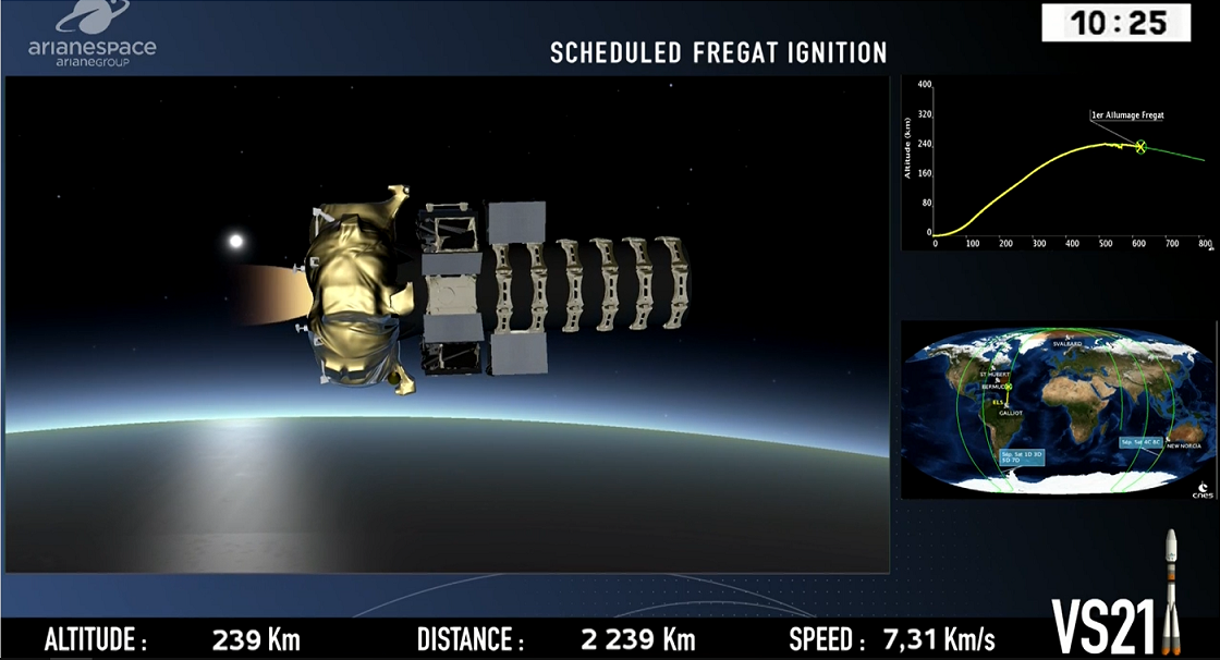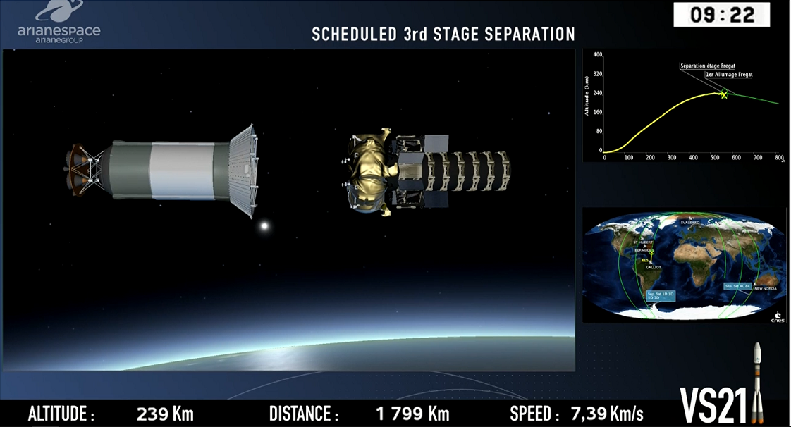 Alle Stufen arbeiten "normal", der Satellit mit der "Fregat-Oberstufe" wird in den Orbit entlassen, die "Fregat" hat noch mehrere Brennphasen abzuarbeiten, bis der Satellit auf seiner Bahn endgültig ausgesetzt werden kann.