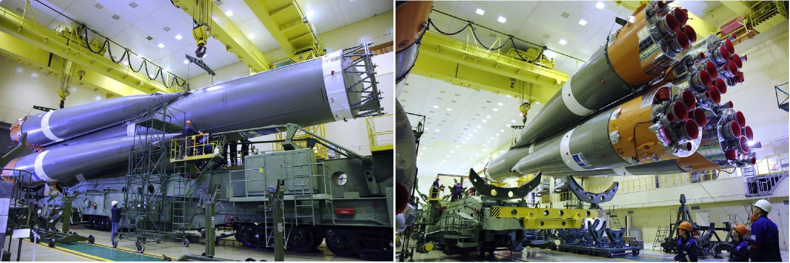 Bild unten: Der Komplex Raumschiff mit Rettungssystem und montierter Drittstufe wird auf dem Transport-Aufrichtwagen an die zweite Stufe montiert.