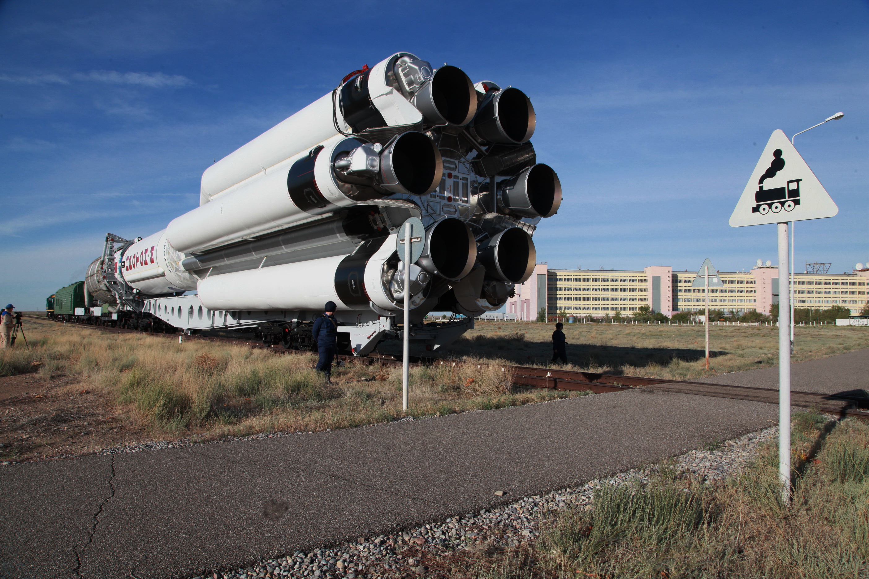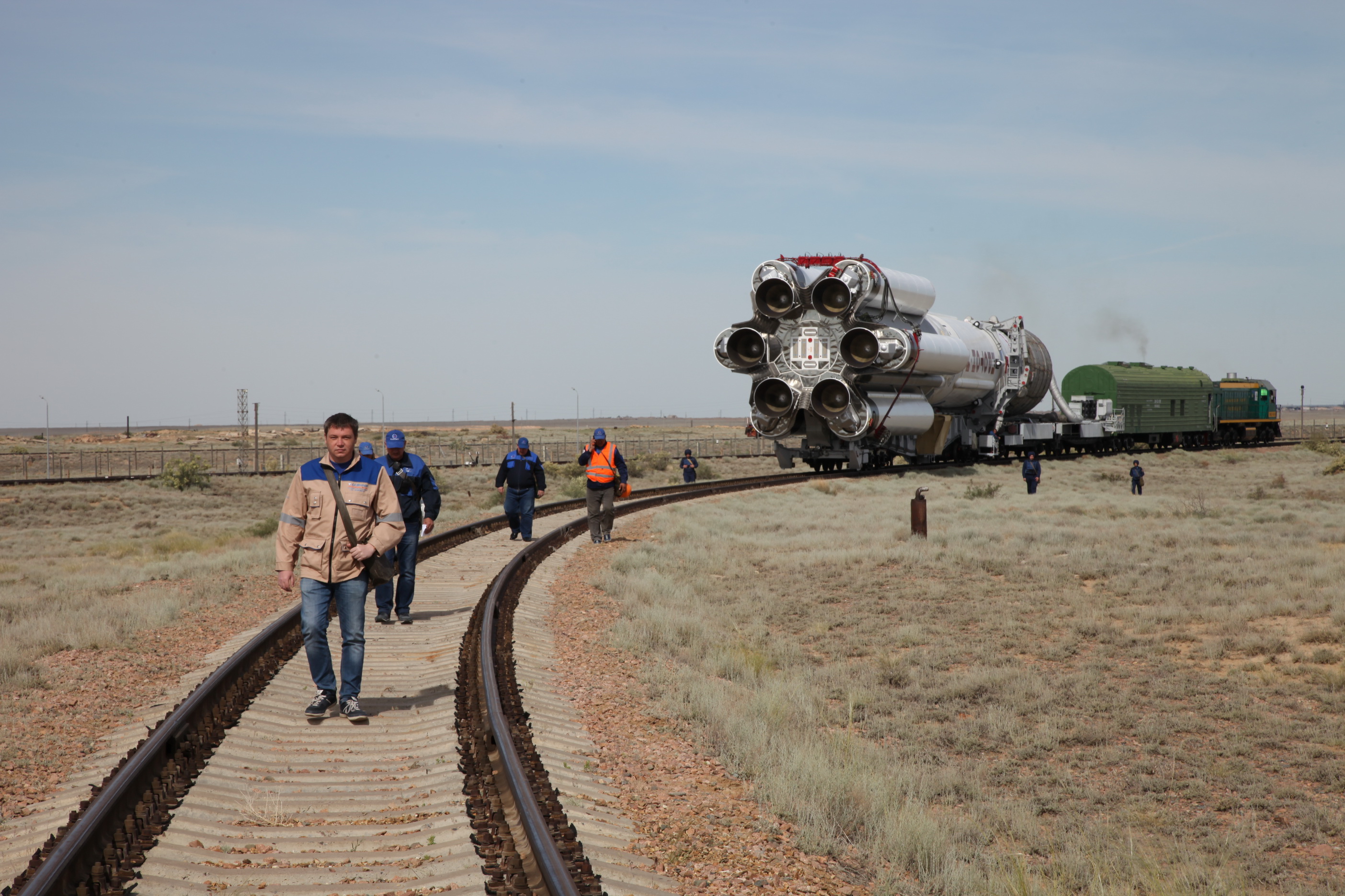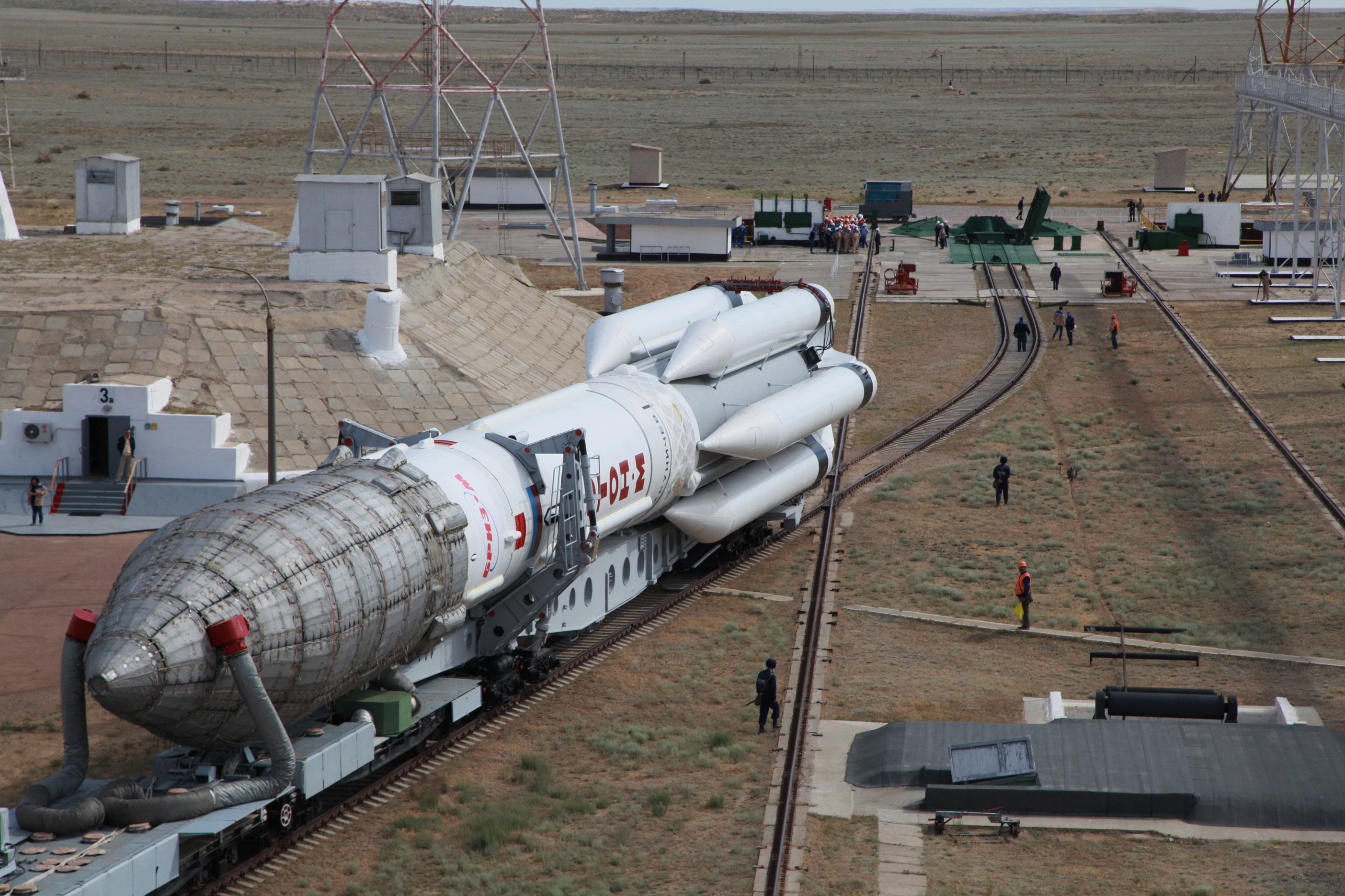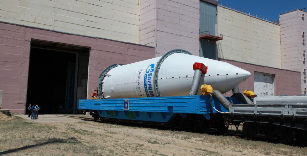 Am 12. April wurde der Träger vom Chrunitschew Space Center in Moskau per Eisenbahn Spezialtransport zum Baikonur-Kosmodrom auf die Reise geschickt.