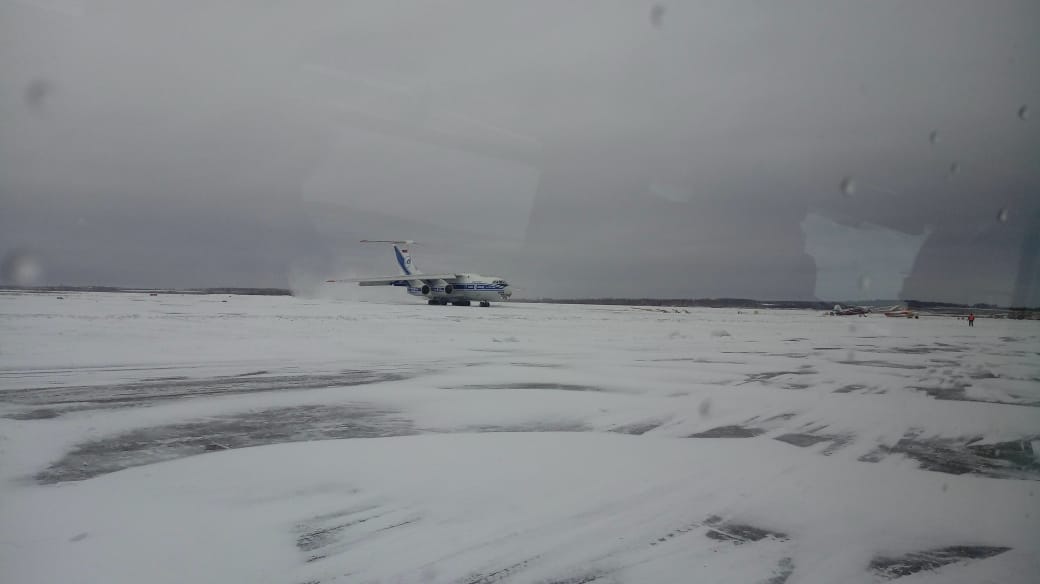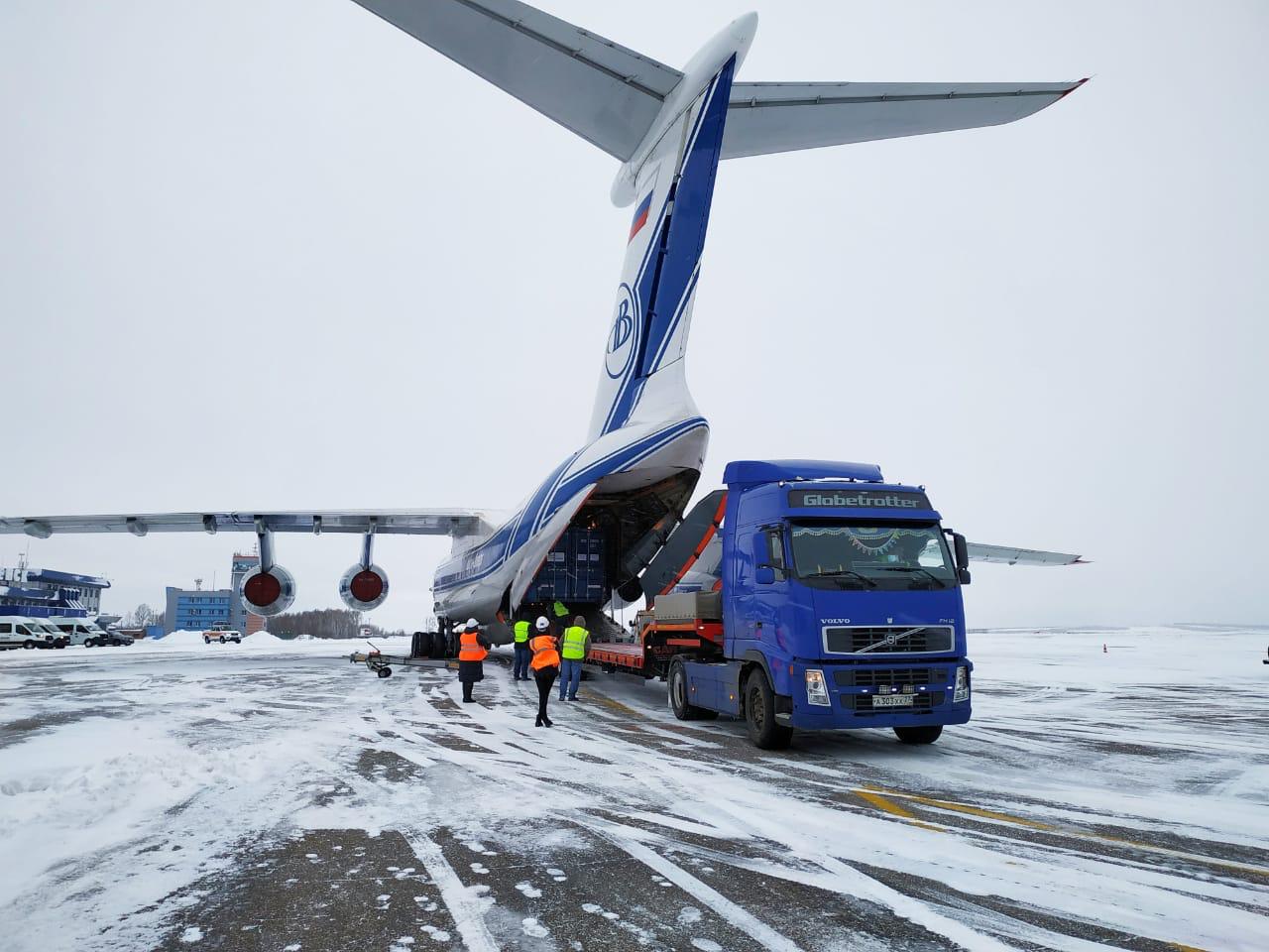 Die Hubschrauber kamen am Flughafen Juschno-Sachalinsk an Bord der An-124-100 Ruslan an, einem der weltweit größten Flugzeuge, das auf den Transport großer und besonders schwerer Fracht spezialisiert ist.