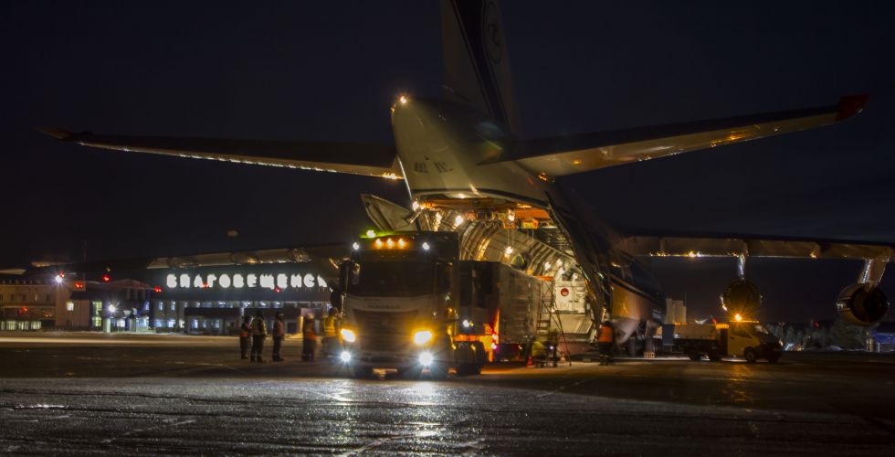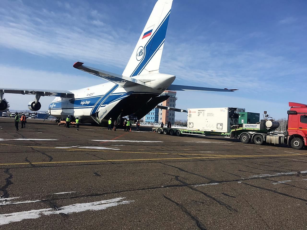 ist heute am Flughafen Blagowschtchensk BQS via Moskau SVO die nächste Fracht von 36 OneWeb-Satelliten, zum Start am 25. März von Wostotschny, gelandet - ein erstes Bild