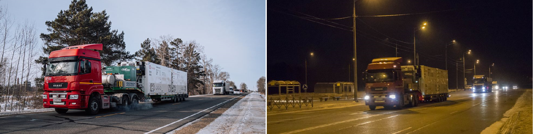 und eine Reihe von Bildern des Empfangs und Straßentransports zum MIK des Kosmodroms