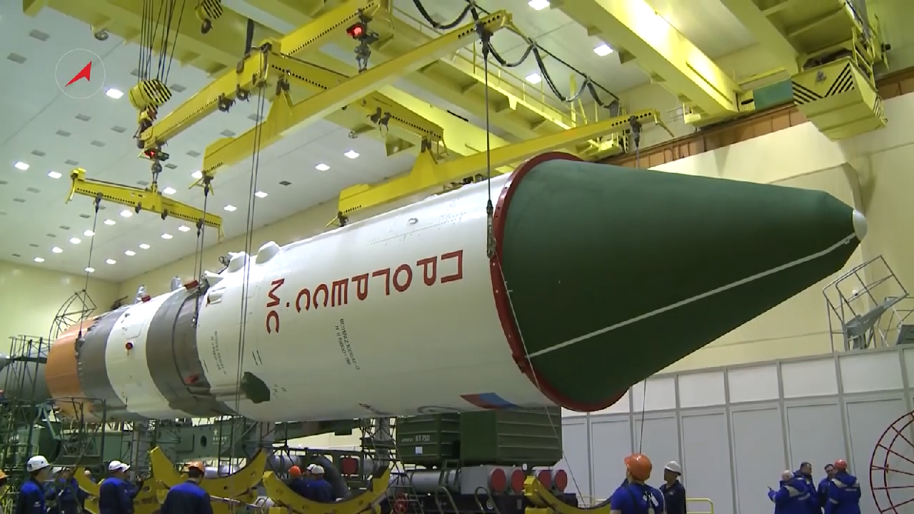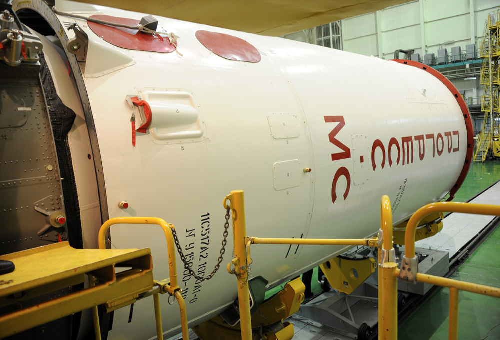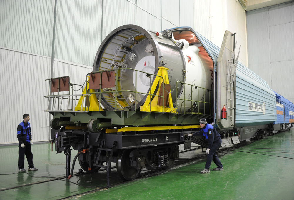 Nach den aufwändigen Vorarbeiten ... wurde gestern in Baikonur die "Verpackung" vorgenommen. Hier sieht man am Korpus zwei flache Behälter, weiß abgedeckt. Dabei handelt es sich um zwei Nano-Satelliten "Tanjusch - JuSGU", die im Orbit ausgesetzt werden sollen.