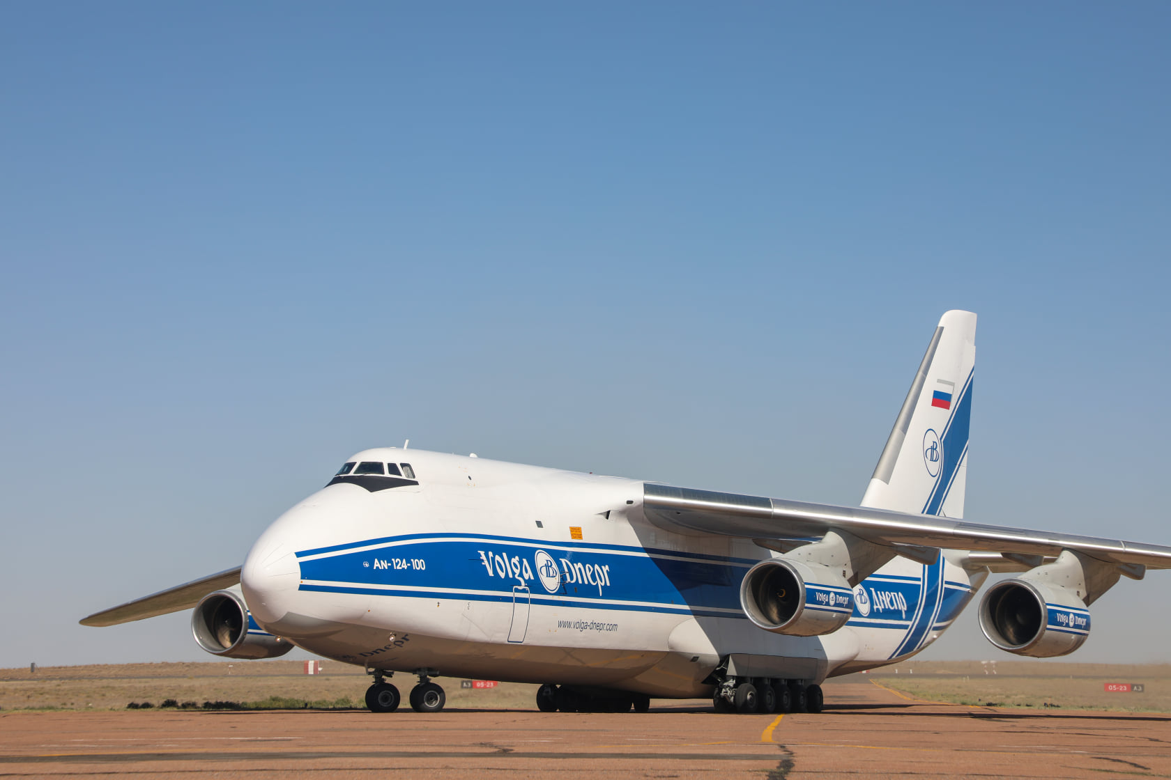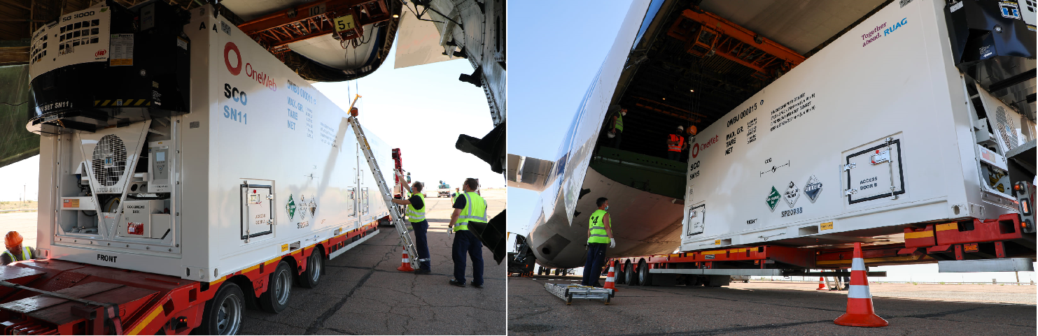 Heute am 25. August landete eine neue Charge von 34 OneWeb-Satelliten mit einer An-124-100 auf dem Stadtflughafen Krainiy.