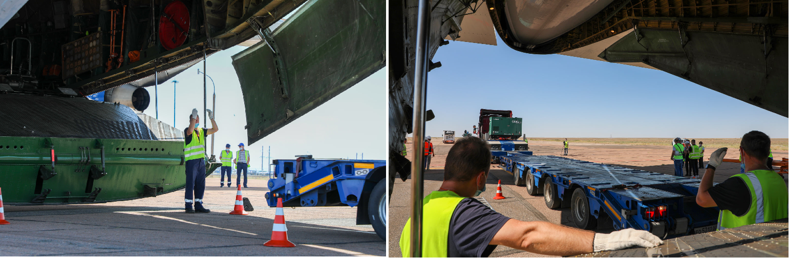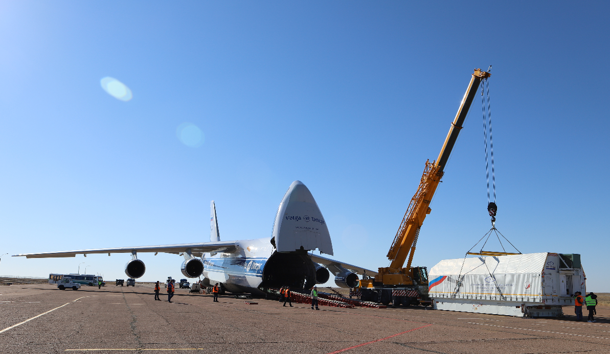 Die Spezialisten des Spacecenters RZ Jushny (TsENKI/Roskosmos) entluden und transportierten die Container zum Kosmodrom, wo das gemeinsame technische Team mit der Vorbereitung der Satelliten für den bevorstehenden Start auf dem Sojus-2.1 b-Träger mit der Fregat-Oberstufe begann.
