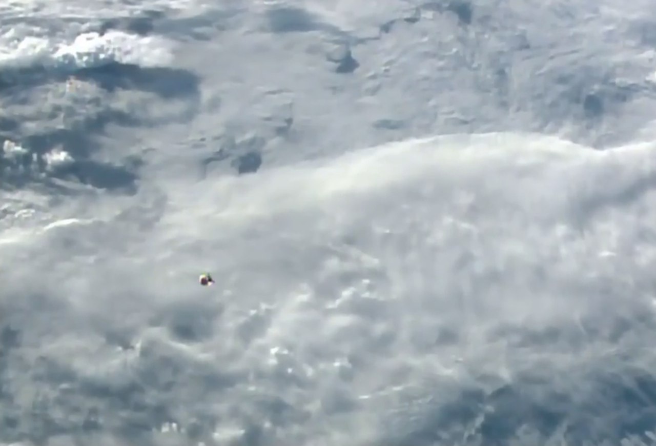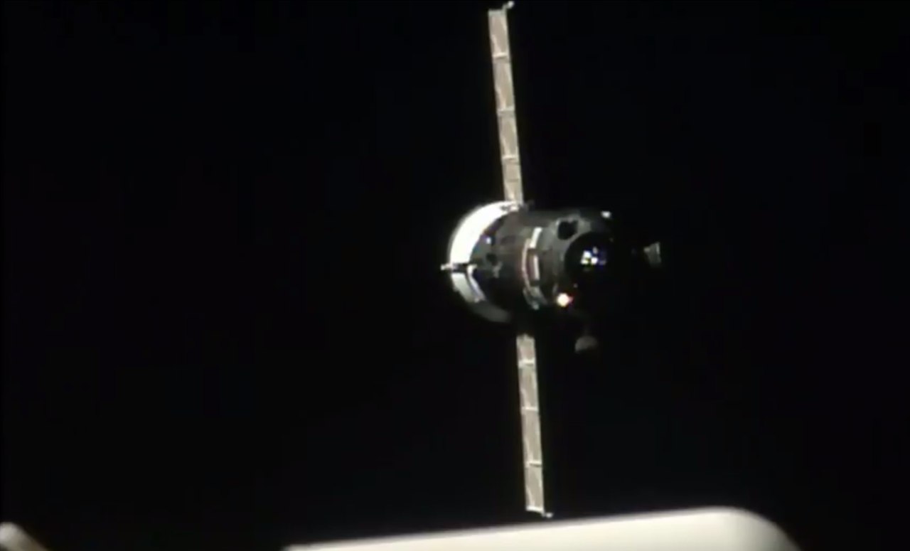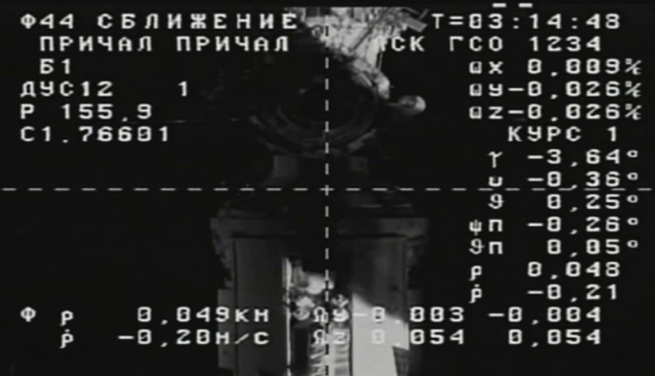 so ~ 7 Minuten vor dem Andocken, 49 m Distanz, 0,2 m/s Annäherung, Triebwerk 1 von 12; Bilder: Roskosmos