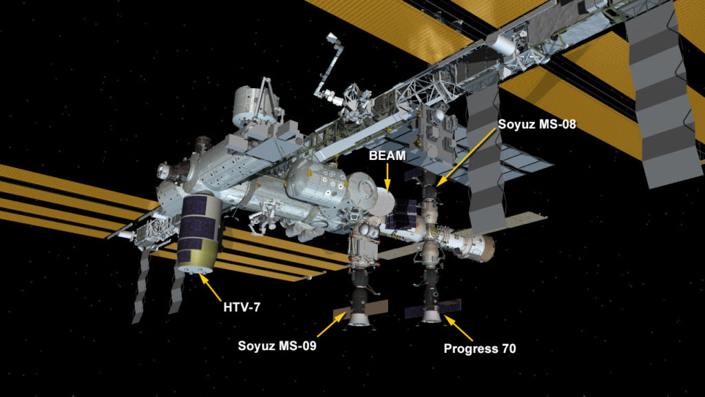Die Expedition 56 mit Kommandant Drew Feustel und FlugIngenieur Ricky Arnold / NASA, zusammen mit FlugIngenieur und Sojus-Kommandeur Oleg Artemjew von der russischen Raumfahrtagentur Roscosmos dockt Sojus MS-08 von der internationalen Raum Station um 03:57 Uhr EDT vom russischen Poisk-Modul ab für ihre Heimreise.