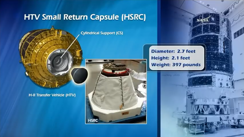 und konnte unmittelbar geborgen werden https://twitter.com/nvslive Die 180 Kilogramm schwere Kapsel war von dem Frachtraumschiff Kounotori 7 (HTV7) nach der Abkopplung von der ISS im Deorbit-Prozess in 300 Km Höhe ausgesetzt worden und 40 Minuten später am Fallschirm im vorgesehenen pazifischen Area niedergegangen. Das mit Abfall beladene Raumschiff verglühte in den dichten Schichten der Atmosphäre.