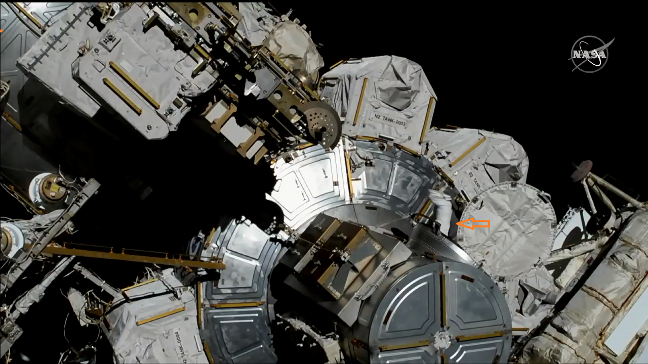 An der Innenschleusenluke haben sich zwei Crewmitglieder zum Empfang bereit gemacht. Die Hermetisierung ist hergestellt. Warum Schutzhandschuhe, Brille und Mundschutz zusätzlich angelegt wurden … möglicherweise als Vorsichtsmaßnahme, wenn Betriebsflüssigkeiten ausgetreten sein könnten oder andere Stoffe kontaminiert haben. (Im Weiteren wurden auch die Anzughandschuhe nach dem Entfernen in Plastebeuteln verbracht, fotografiert …, das hat alles gedauert.