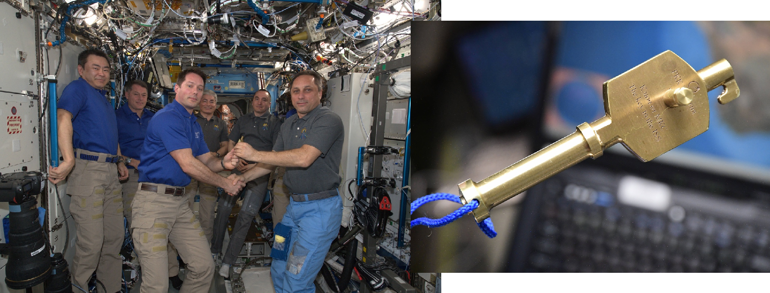 Der aktive Kommandant, ESA-Astronaut Thomas Pasquet übergibt dem neuen Kommandanten Anton Schkaplerow den (symbolischen) Stationsschlüssel zur ISS -