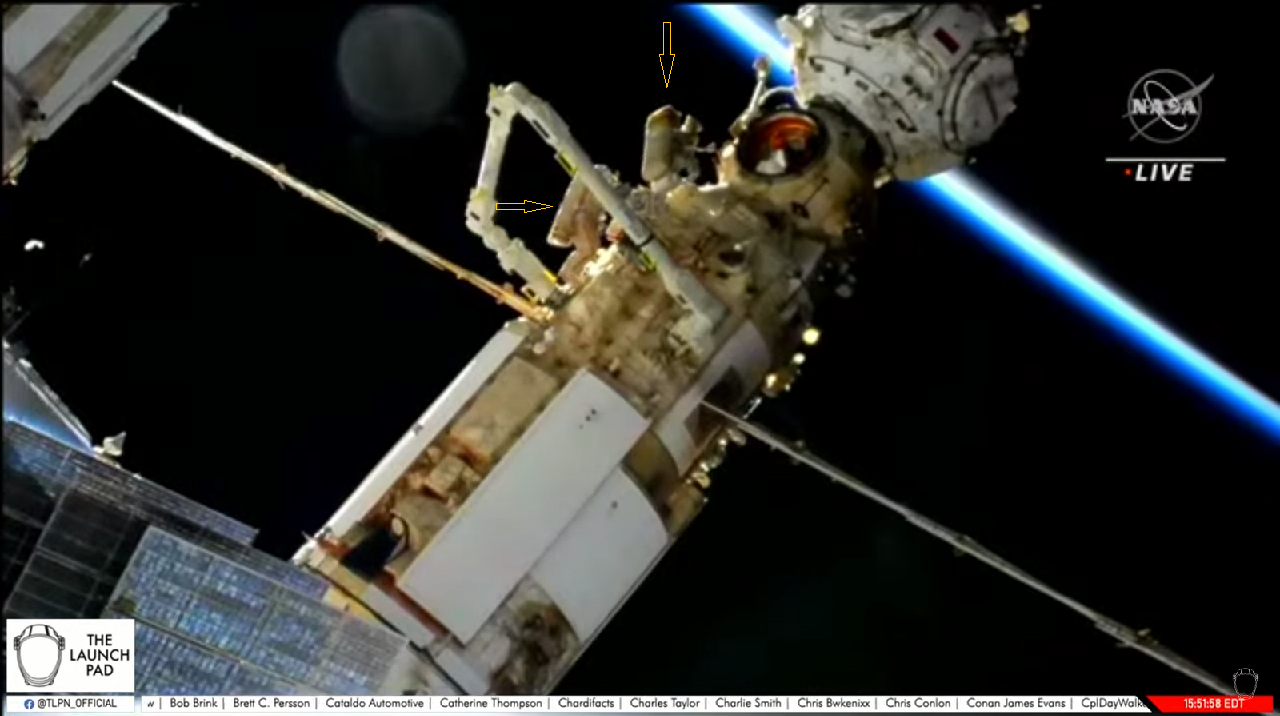 - Bis zur Einschränkung des SpaceWork hatten Artemjew und Matejew erfolgreich zwei Kameras an den Ellbogen(Gelenk-)bereichen des European Robotic Arm (ERA) installiert und die Wärmedämmung und eine Startrückhalteeinrichtung von einem der beiden Endeffektoren oder "Greifern" am gegenüberliegenden Enden des Arms entfernt.