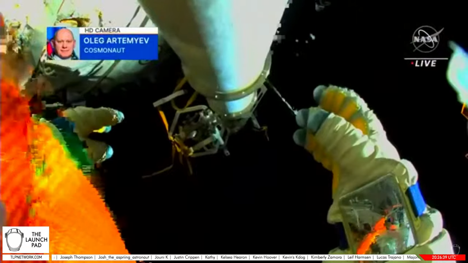 - eine Übersicht - Oleg im Bild - Samanthas Helmkamera, oben kommt Oleg ins Bild (rote Anzugstreifen) hier wird mal die Zeit eingeblendet, man nähert sich dem Limit (beide hinter dem Roboterarm) Am Ende wurden es 7 Std. und 5 Min Außenbord für Samanthas Bordbuch und Oleg natürlich