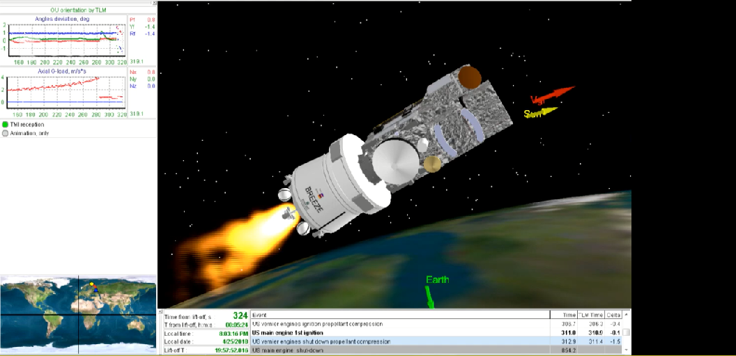 Das erste Brennende der Breeze-KM Oberstufe (Beschleunigungsblock); es beginnt ein passiver Flugabschnitt Dauer ~ 1 Stunde über das Festland hinaus und den PazifikDer grüne Verlauf ist die passive Phase, Rot des Orbitalkomplexes = keine Telemetrie / Funkschatten