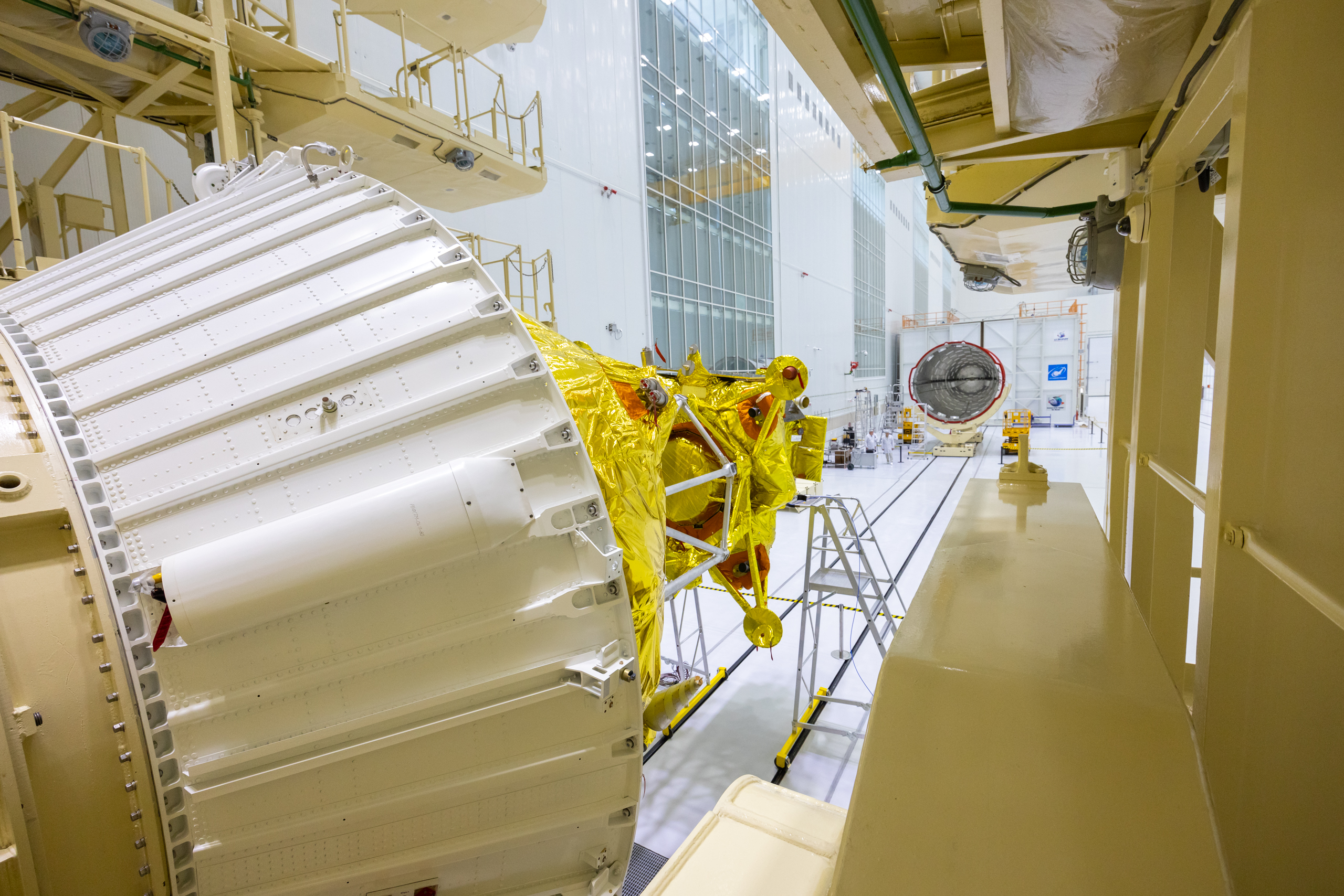 Alle Tests sind abgeschlossen, die Kopfverkleidung wurde über die Station gerollt Q.: Foto: Natalia Berezhnaya / Roskosmos Medien [edit]