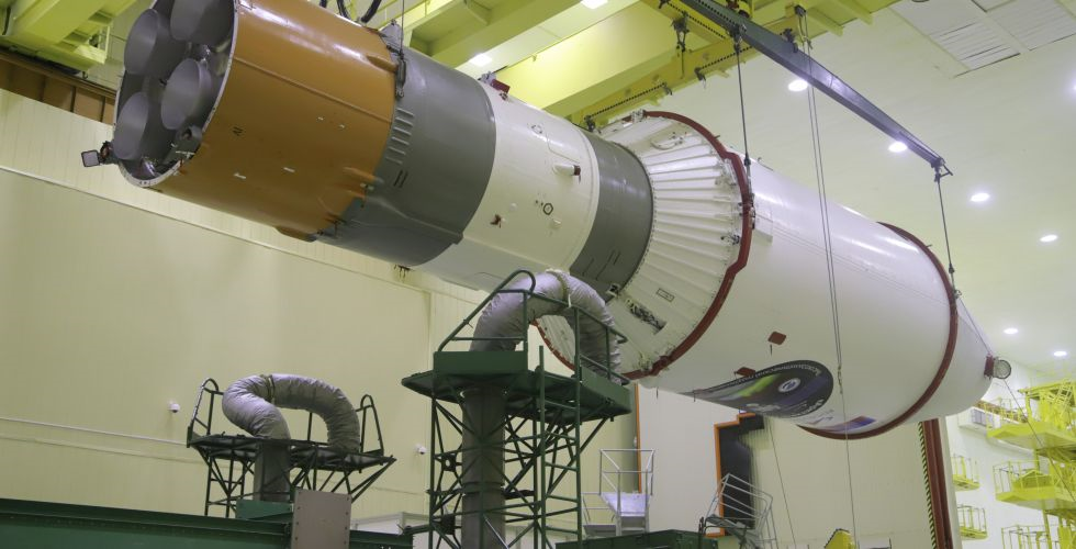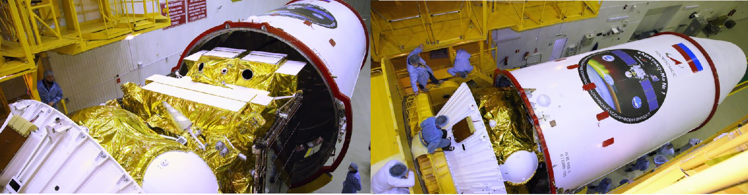 Das "Verpacken" und mit der integrierten Drittstufe geht das Paket Arktika-M/Fregat-OS zur Trägermontage Fotos: RZ "Jushny"/Roskosmos
