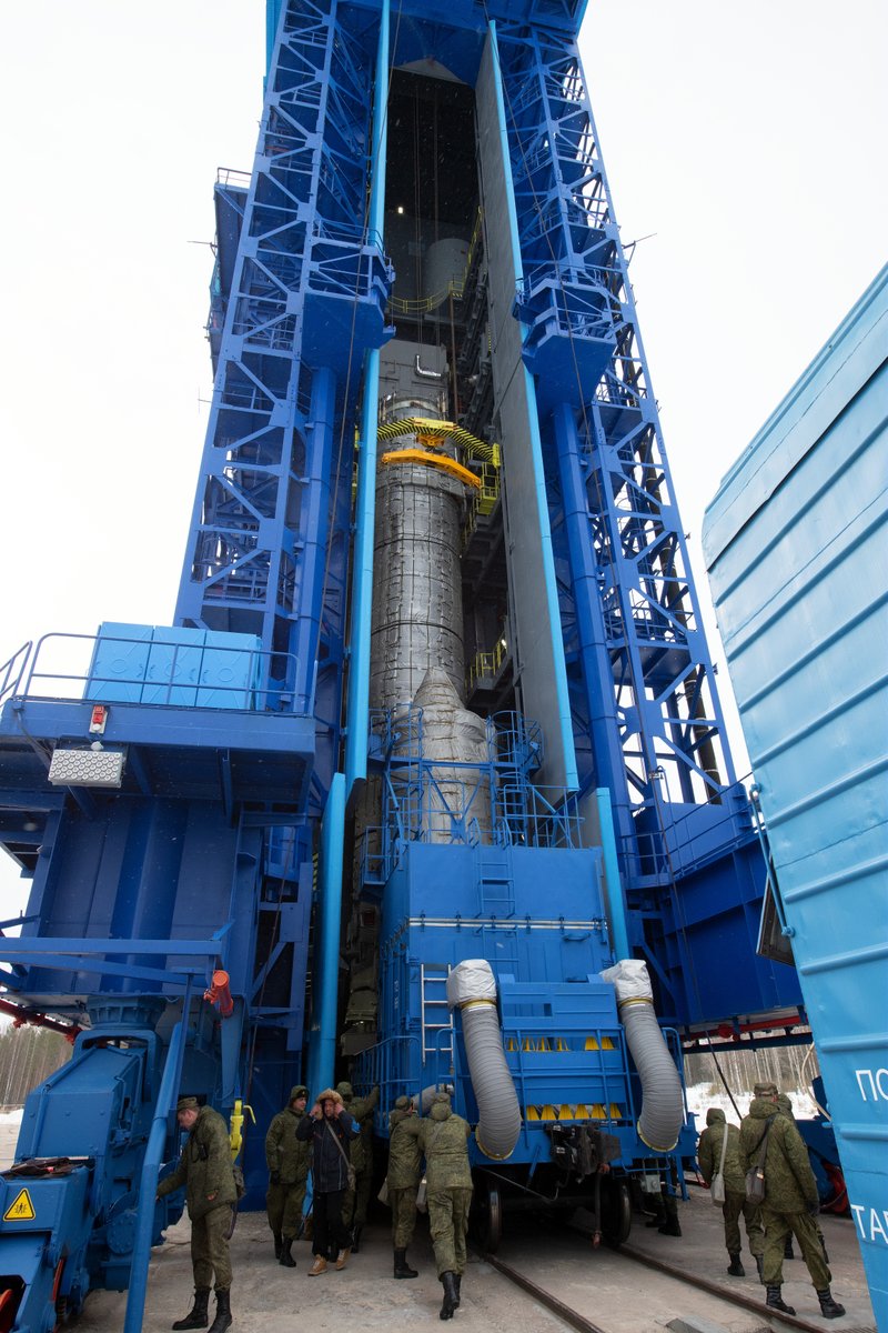Am Startplatz angekommen, wird die Nutzlast mit dem im Turm stehenden Träger integriertQ.: ESA https://www.esa.int/spaceinimages/Image ... _the_Tower
