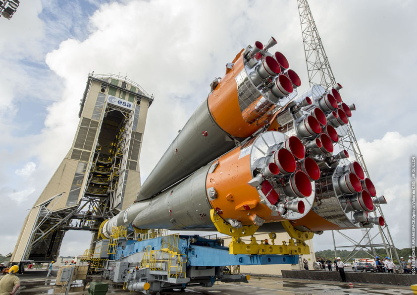 Wir sehen, in Kourou wird anders Integriert - die Fregat- Oberstufe mit der Nutzlast 2x Galileo wird im Montageturm senkrecht drauf gesetzt, auch interessant
