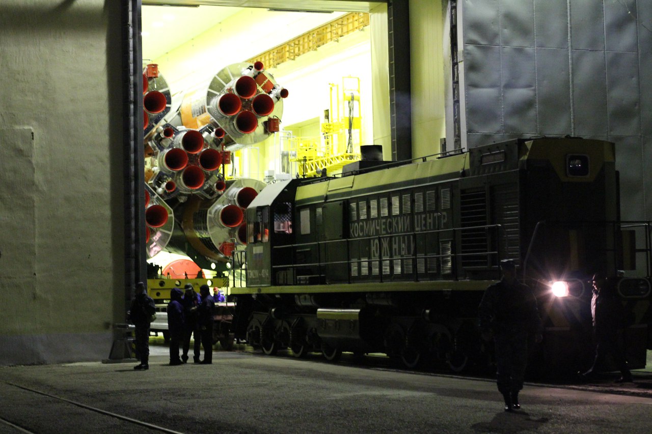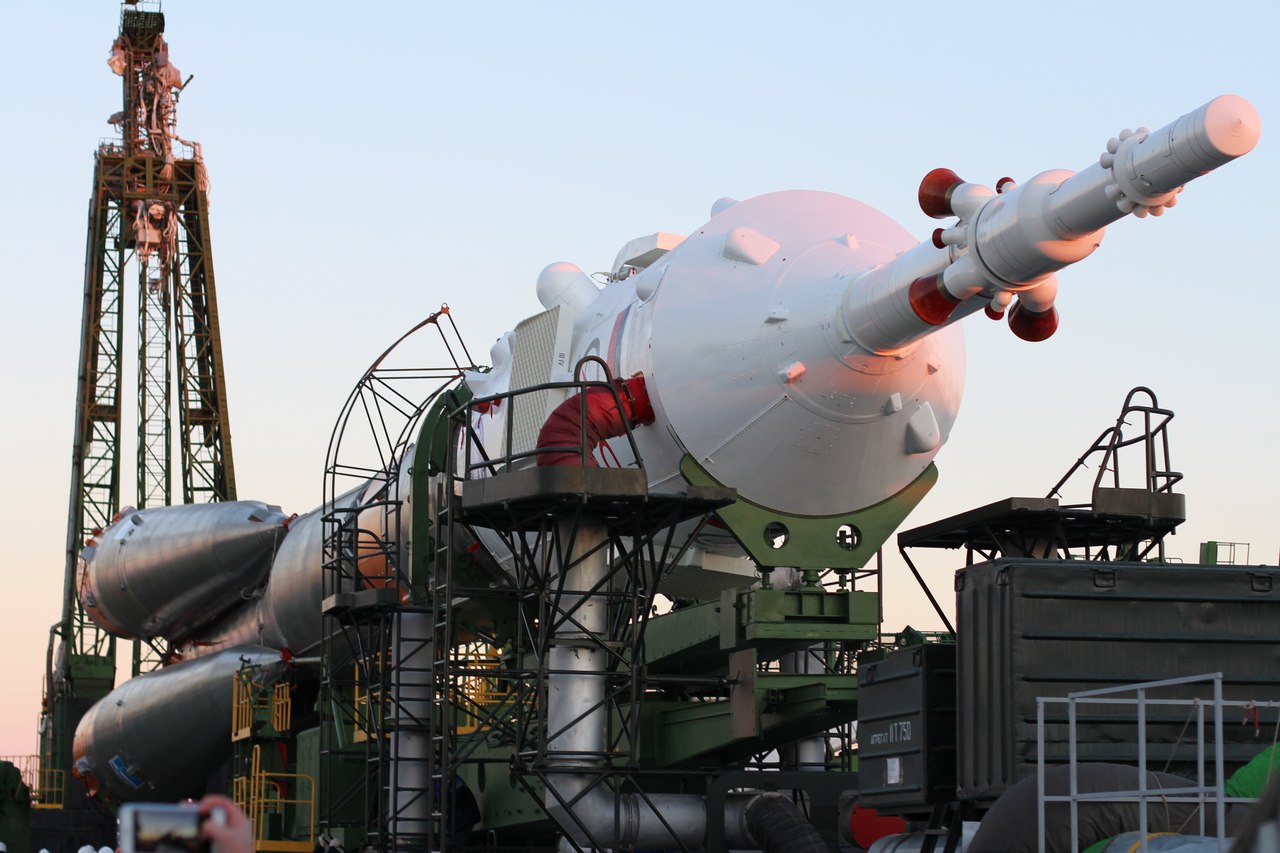 und zeigt den Startplatz Arbeitsplatz seitig - die Sojus dampft so vor sich hin