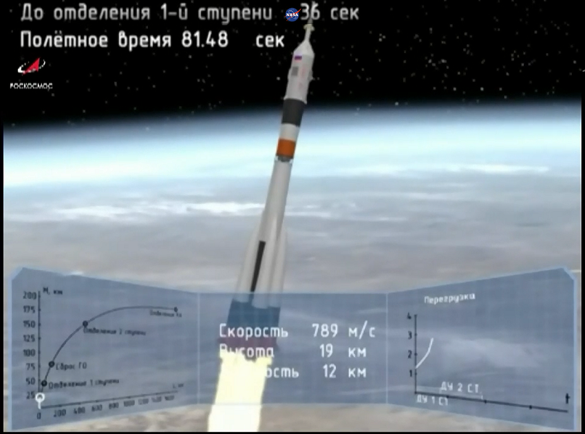 Der Flug verläuft in allen Phasen normalni - gleich Gmax Die Erste (Blöcke B, W. G, D) und Zentralstufe sind normal getrennt, die Dritte feuertSeparation - Im Orbit! Höhe 202 Km - Die Solarpaneele und Antennen sind entfaltet, Prüfung der Dichtheit der Station … nach Aufholjagd die Kopplung in 6 Stunden d.h.: 02:07 Uhr MEZ, wenn weiter alles glatt läuft (die NASA überträgt selbstverständlich den Anflug ab 01:45 Uhr)