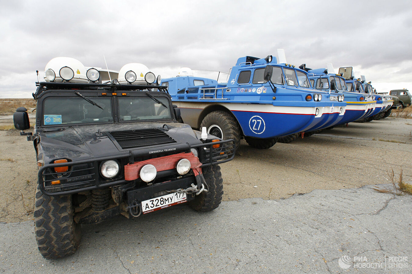 - "Vorbereitungen finden in der Region Tscheljabinsk statt, Retter führen Fallschirmspringen aus einer Höhe von etwa 1500 Metern auf die Wasseroberfläche aus, arbeiten, um die Kapsel auch aus dem Wasser zu bergen mit Hilfe von amphibischen Suchfahrzeugen "Blue Bird" und zu evakuieren