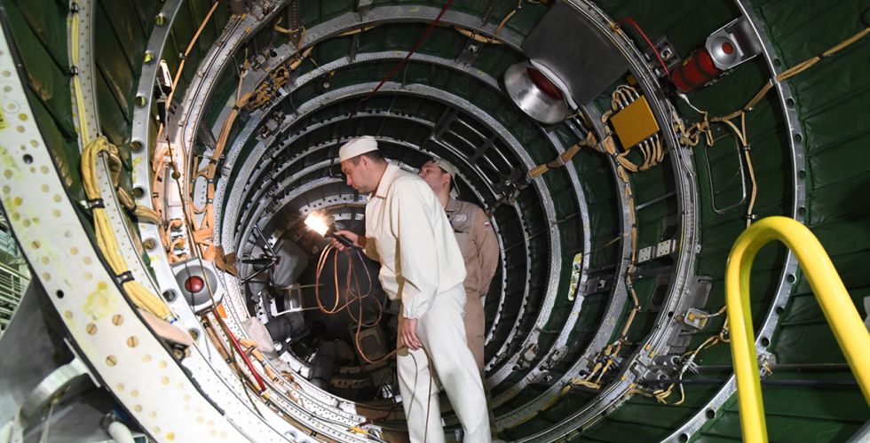 Ein eher seltener Blick "In die" Nutzlastabdeckung (das die Kollegen der Endkontrolle hier mit Ballettschuhen auf den Stringern und Spanten wandeln, ist schon merkwürdig)