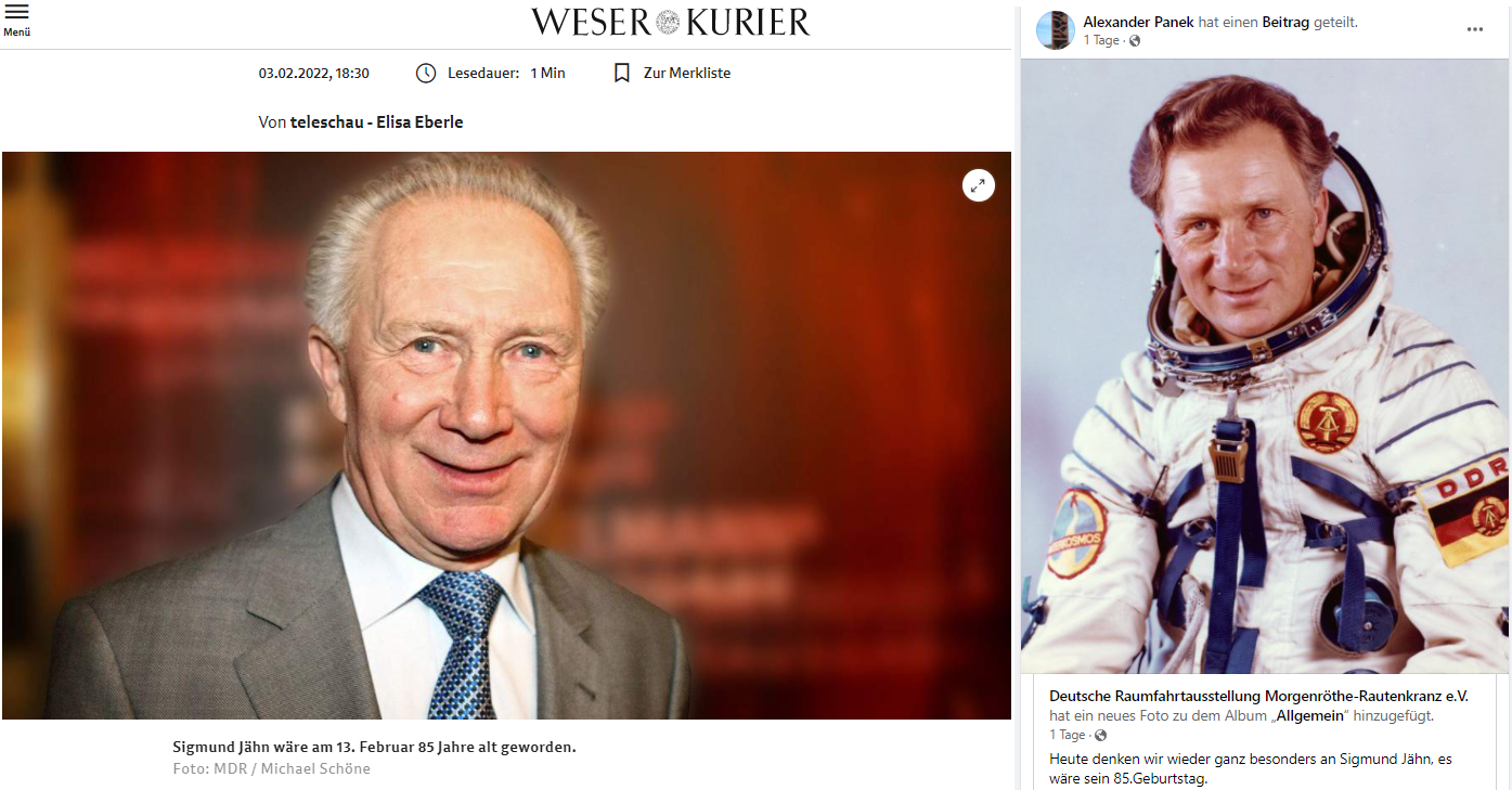 Er will -auch in Absprache mit der Familie S. Jähns- Klarheit erlangen, warum der erste Deutsche im All nie eine bundesdeutsche Ehrung erfahren hat.