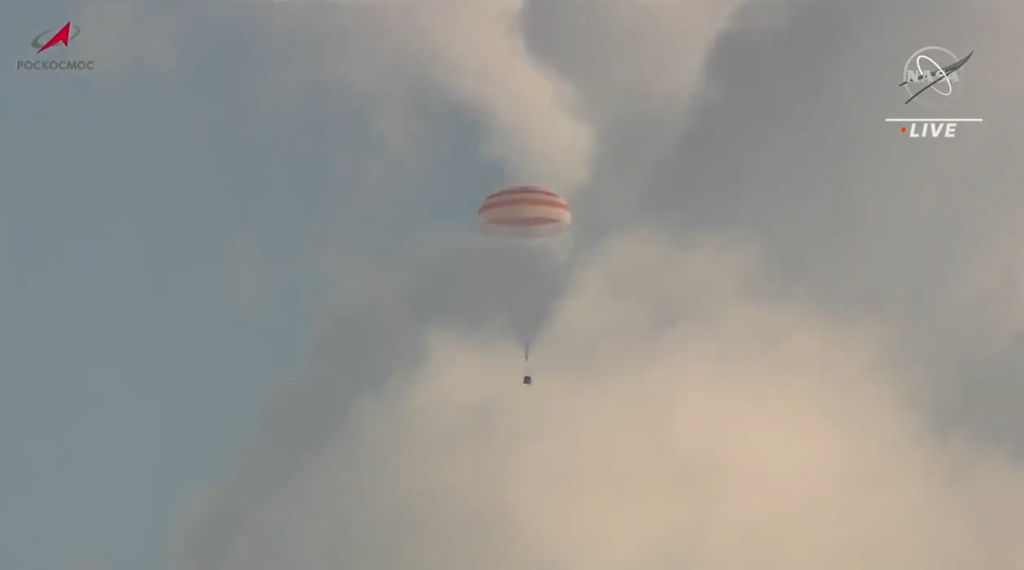 "Heute um 14:17 Uhr Moskauer Zeit landete das Abstiegsmodul des Raumschiffs Sojus MS-23 mit den Kosmonauten Sergej Prokopjew und Dmitri Petelin sowie dem Astronauten Francisco Rubio in der Nähe der kasachischen Stadt Dscheskasgan".