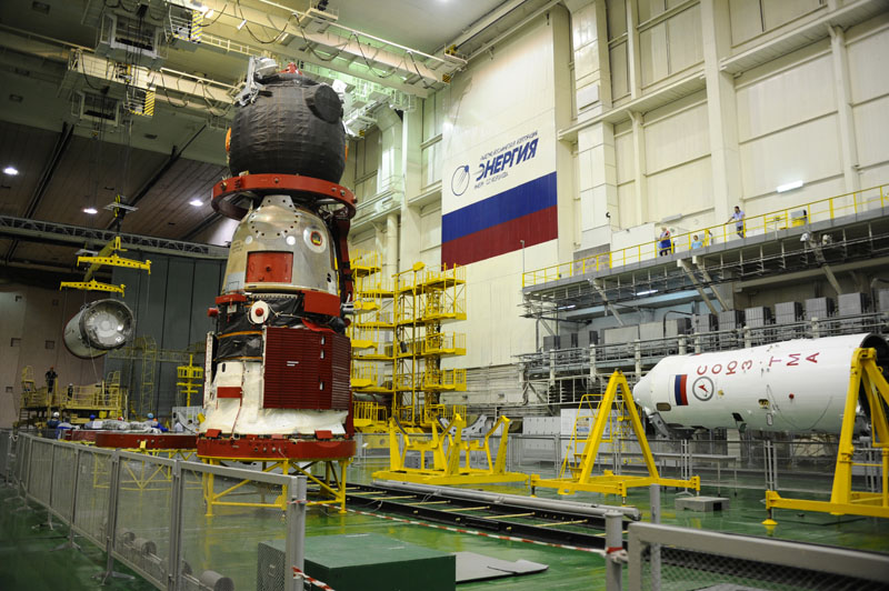 Hier die Sojus TMA - 17 in der Montage/Integrations-halle:Foto: Energija Derzeit alles nach Plan - der letzte Sojus 2.1 Versorgerfehlstart -Progress 27M- ist abgehakt, die Besatzung in vollem Vertrauen auf die Technik.