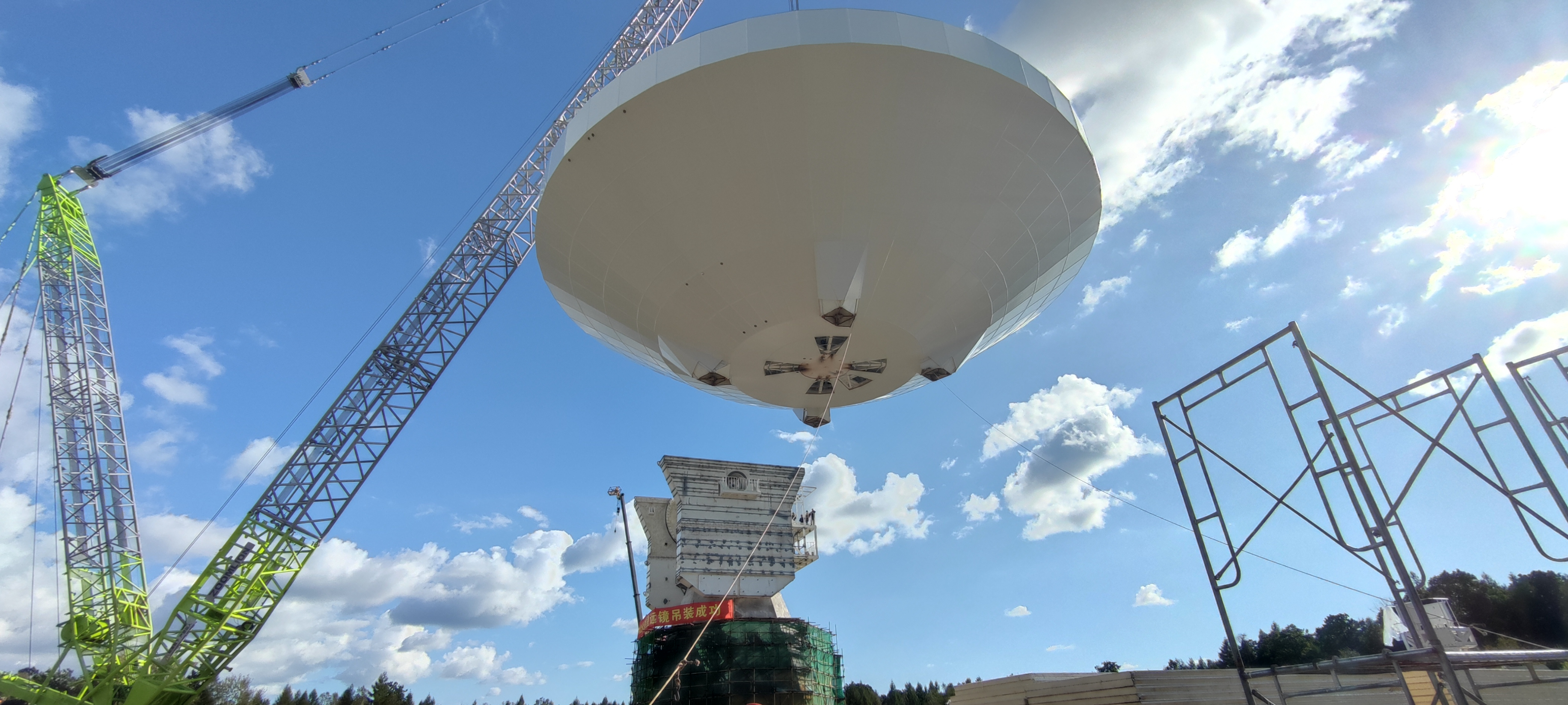 am 27. August wurde berichtet, daß der Hauptreflektor der 40-Meter-Radioteleskopantenne im Changbai-Berg in der Provinz Jilin, erfolgreich auf sein Lager gehoben (vermutlich im Mai schon), was den ersten Abschluss der mechanischen Montage der Antenne markiert, die eine gute Grundlage für das anschließende Servo-Debugging und die elektrische Abnahme bilden wird.