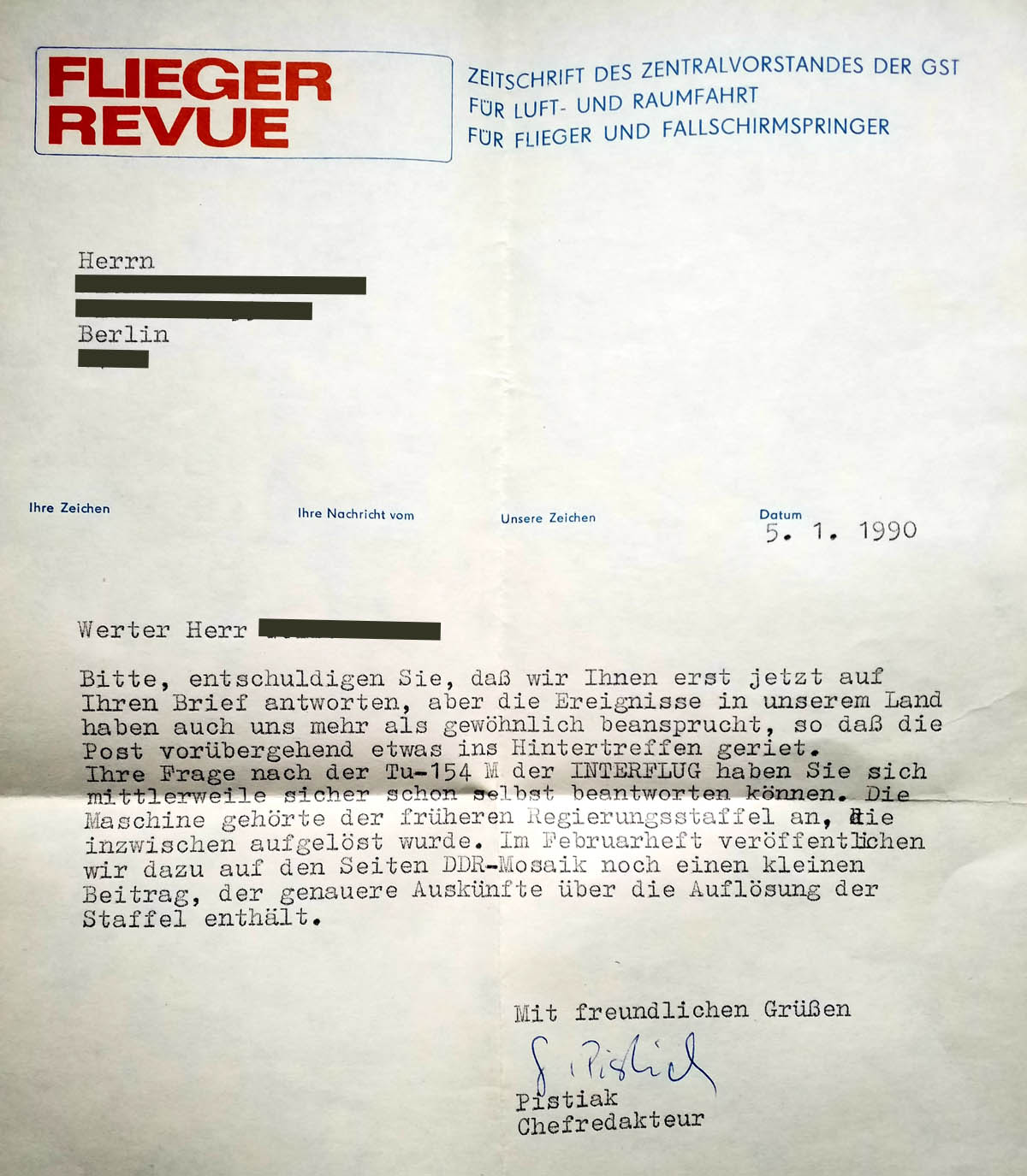 Wenn die Wende nicht dazwischen gekommen wäre dann nicht. Bis Dezember 1989 wurde dort zensiert. Für die beiden Tu-154M galt Publikationsverbot. Wurde mir so berichtet damals. Die genaue zeitliche Reihenfolge kann ich aber nicht mehr wiedergeben.