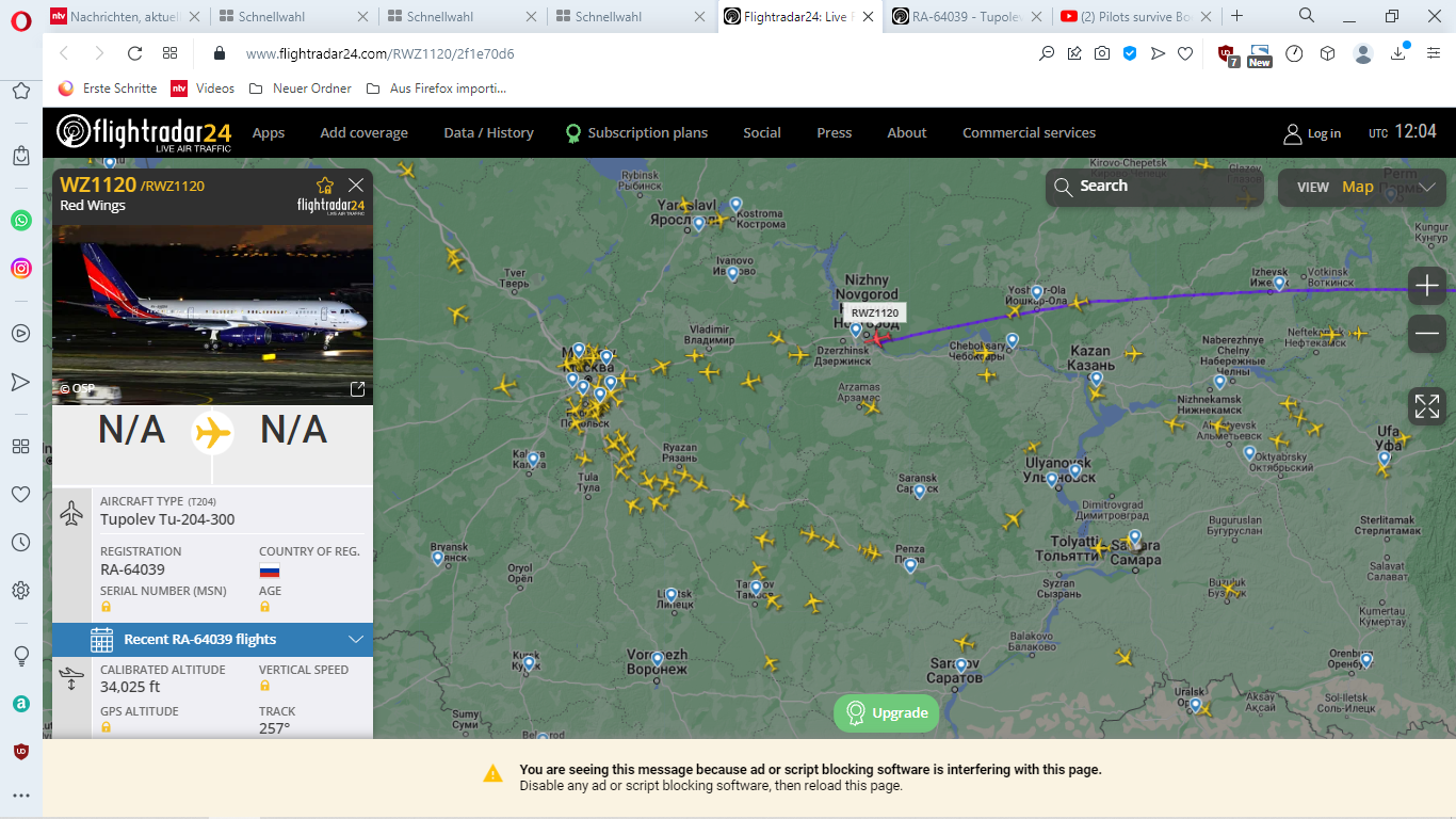 Immerhin ist der 34 Jahre (!) alte Prototyp der TU-204 mit dem Kennzeichen RA-64001 offenbar wieder reaktiviert und steht seit Stunden mit eingeschaltetem Transponder in Saratov auf dem Vorfeld. Irgendwie muss die da auch hingekommen sein, denn viele Jahre stand sie in Moskau in bedauernswertem Zustand abgestellt. Wenn sie tatsächlich dorthin geflogen sein sollte, dann ging diese Aktivierung wirklich erstaunlich schnell.
