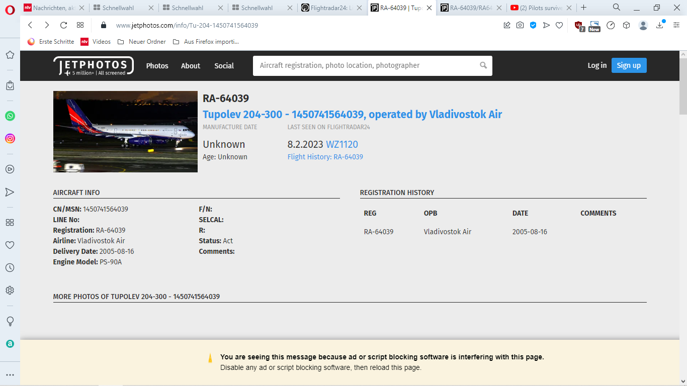 Heute war/ist eine Tu-204-300, Kennzeichen RA-64039 in den (neuen) Farben von Red Wings unterwegs. Sie kam aus Peking, wohin sie am 04.02. geflogen war. Bis 2013 war sie für Vladivostok Avia unterwegs, danach abgestellt und nun wieder reaktiviert.