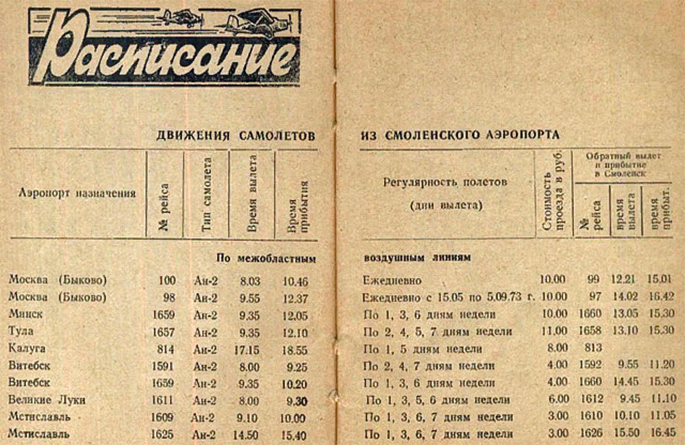 Hier ähnliche Werte mit einem Beispiel, von Smolensk nach Mstislawel, Distanz etwa 80 km. 50 Minuten Flug mit An-2, Preis 3 Rubel. Das waren so glaube ich etwa 10 DDR-Mark gewesen.