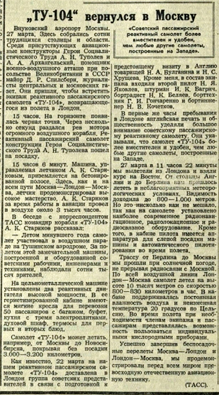 Re: Tu-104, Berichte